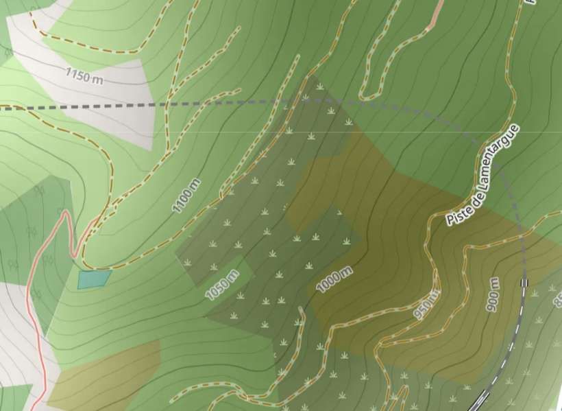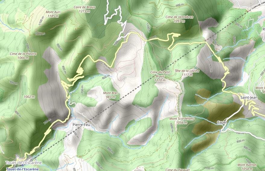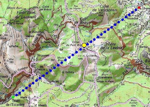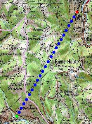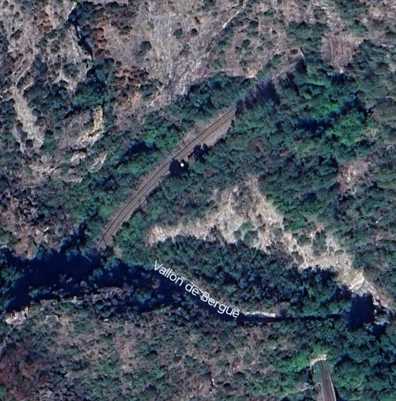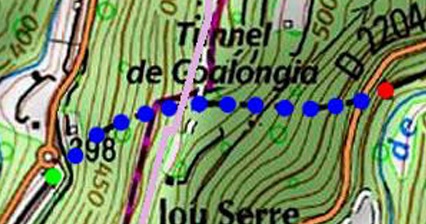 The line of the Tunnel de Carabacel is shown by the red, blue and green dots. It is 663 metres in length. [27]