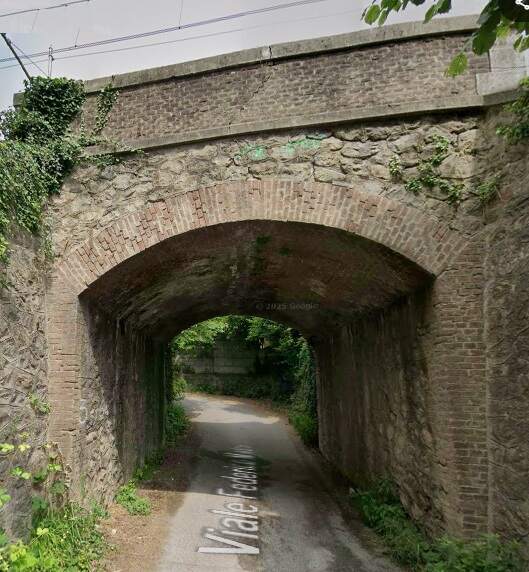 A brick-ringed arch bridge carries the railway over a side road off Viale Federico Mistral. This view is from the Southeast. The structure is at the top-right of the map extract immediately above. [Google Streetview, June 2025]