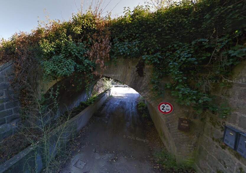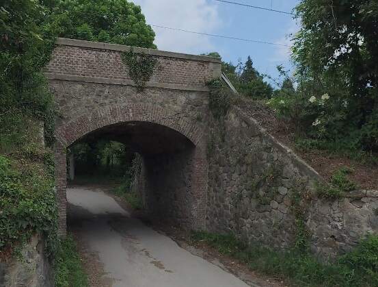 A typical example of the stone retaining wall that holds the railway above the immediately surrounding land and the modern road. The retaining wall is pierced by a stone-arched underpass. A number of such underpasses provided for access under the railway when it was first built. [Google Streetview, February 2025]
