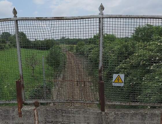 The view Southwest from the bridge carrying the SP21 over the railway. The route of the older line is marked by the field boundary visible to the left of the line. [Google Streetview, June 2025]