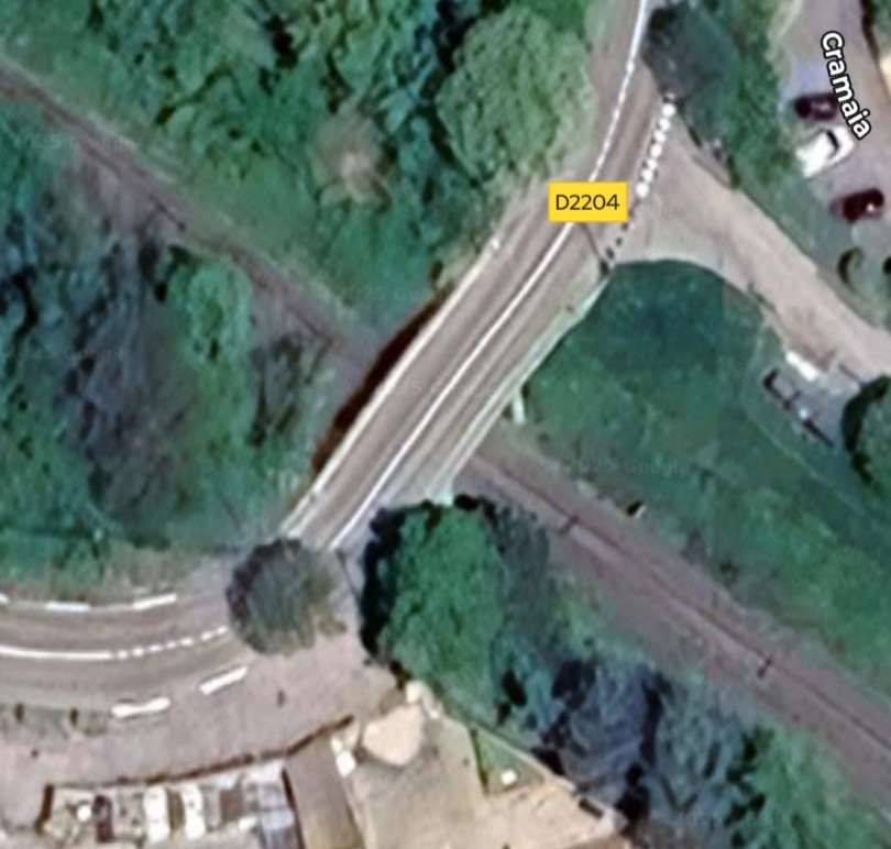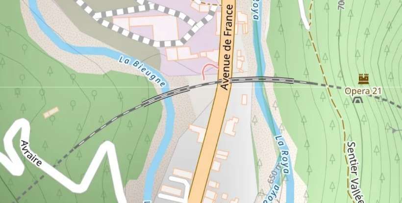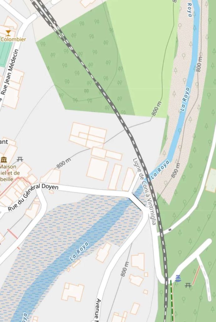 The area to the West of Nice-Depot and Saint Roche Station. The line crosses three roads on its way to the riverbank. [Google maps, September 2025]The first of these structures, seen looking North from Avenue Denis Semeria provides access under the line to Nice-Depot. [Google Streetview, February 2025]The same bridge, seen from the North (from the access road to Nice-Depot. [Google Streetview, October 2022]