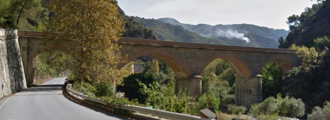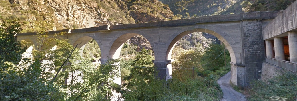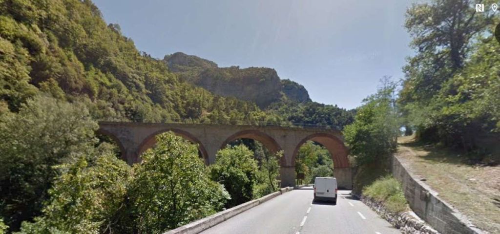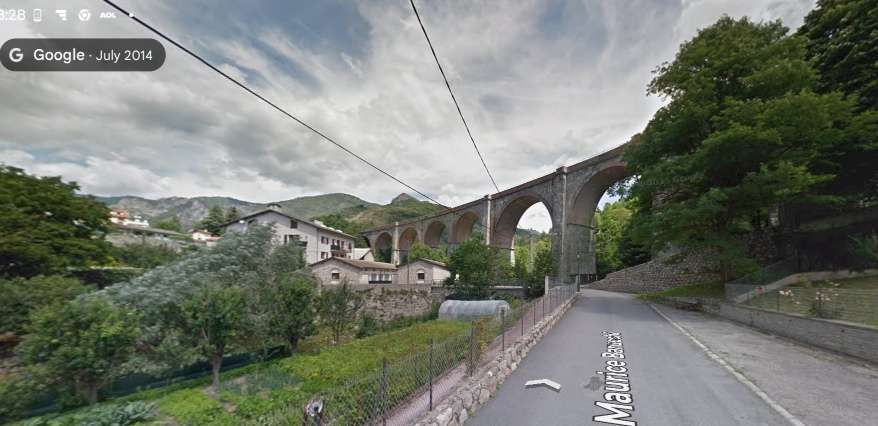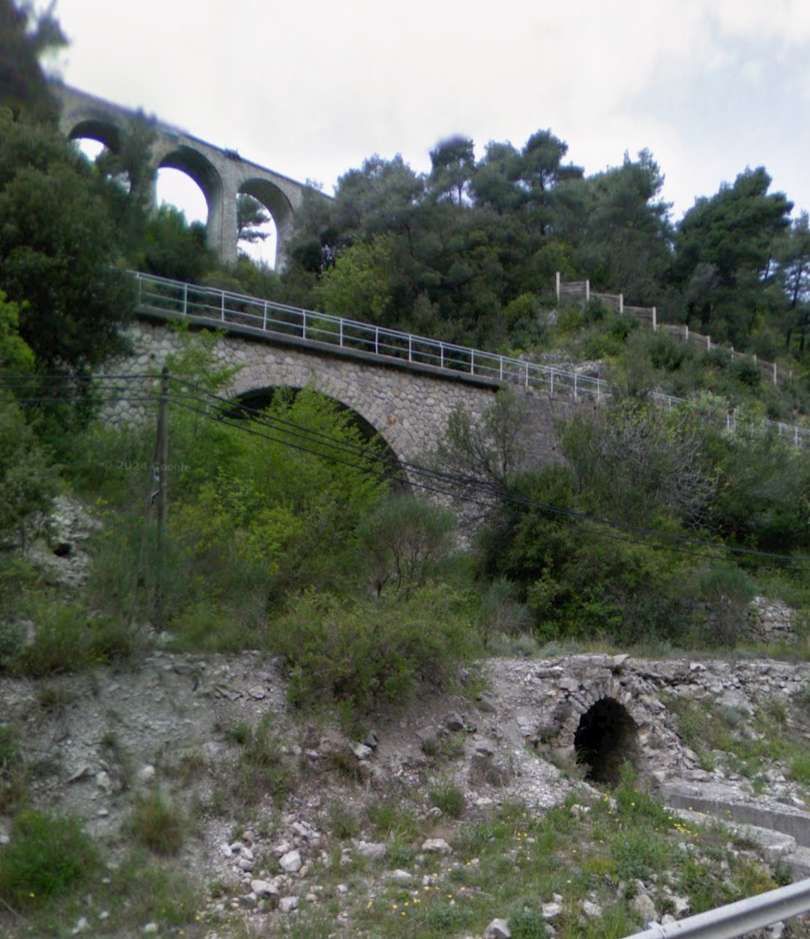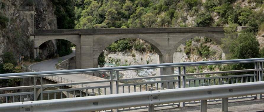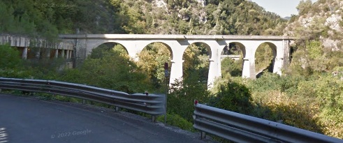 A more modern structure now spans the M2204B, Route de Turin. [Google Streetview, March 2025]A similar aged steel bridge spans Boulevard Jean Baptiste Verany adjacent to the River Paillon. A series of graceful arches make up the railway viaduct across the Paillon. [Google Streetview, March 2025]The Stone-arch viaduct across the River Paillon seen from the Southeast – 3 spans, 127 metres in length. [Google Streetview, March 2025]The same structure seen from the Southwest on Avenue du Maréchal Lyautey. The three arches over the river are clearly visible and the two steel spans at either end of the structure are also visible. [Google Streetview, March 2025]