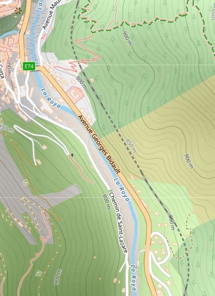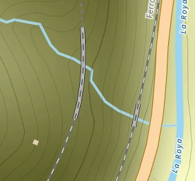 Continuing Southwest alongside the Paillon the railway runs to the East of the modern road which sits below the flood defences on the East side of the River Paillon. The road is a later addition to the river bank and is protected from the river by a high retaining wall. To its East, the railway sits on a stone embankment. …