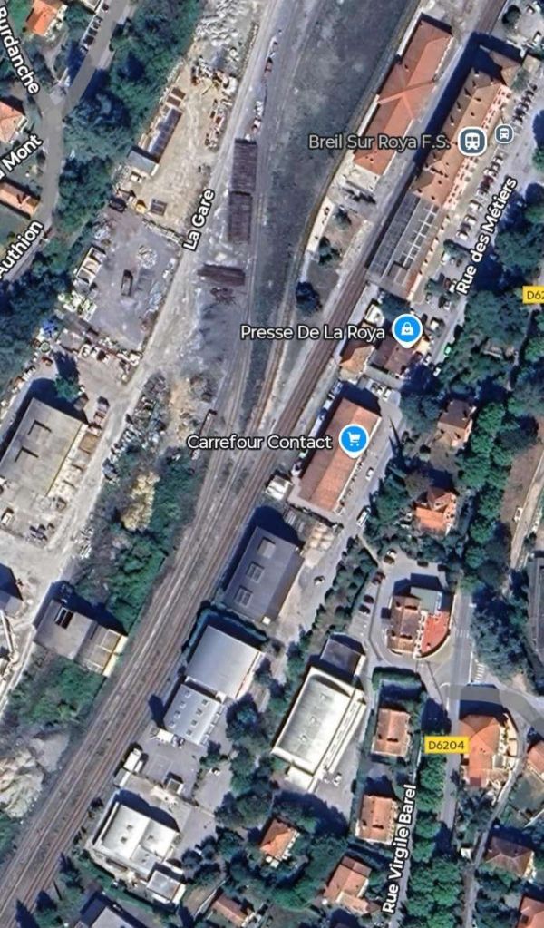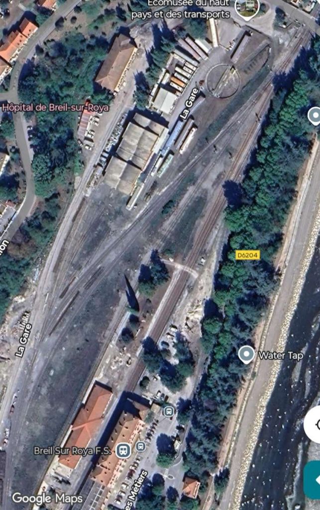 Looking South across Pont Michel. The running lines from Breil-sur-Roya are on the left of this image. The other lines are part of Nice Depot. Pont Michael Railway Station is at the bottom of the image. See the notes below about the history of this location. [Google Earth, September 2025]