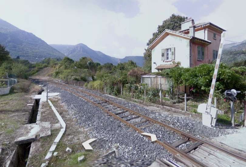 A level-crossing and railway house just beyond Tunnel de Serradone. The crossing takes Terre d’Eze across the line. [4]