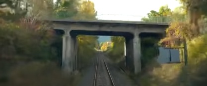 A three arch bridge carries Via Fontanelle over the railway, seen again in the evening light from the South through the rail-spattered cab widow of a multiple unit. [45]