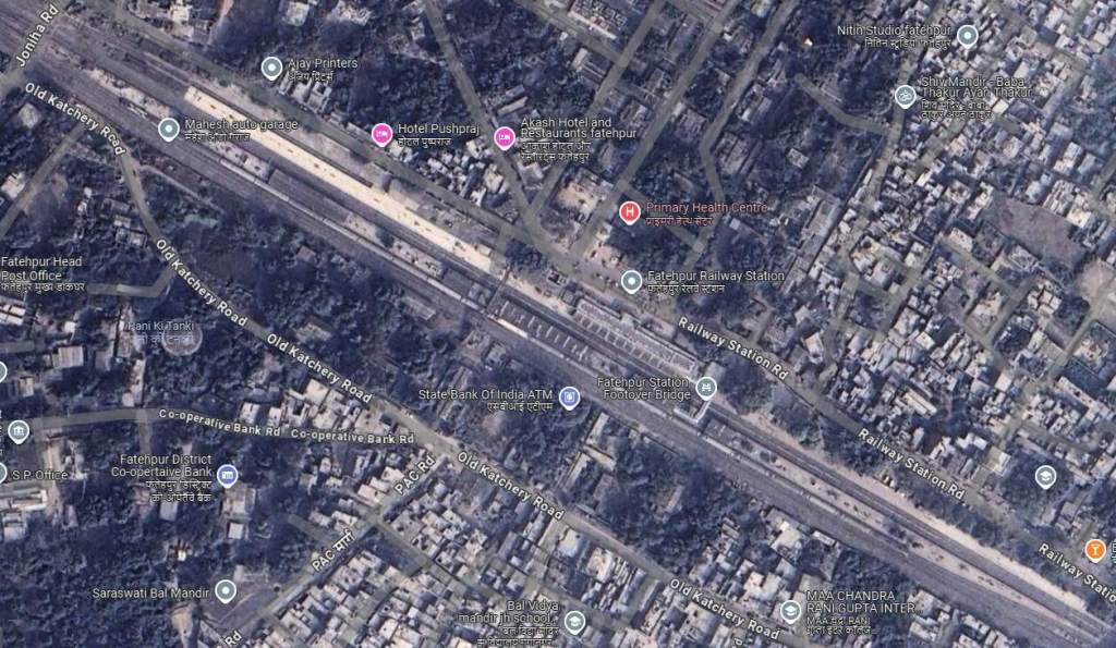 To the East of Mainpuri Railway Station, the next station is Mainpuri Kachehri Railway Station, just to the East of the Sugaon to Husenpur Road.