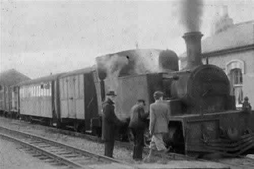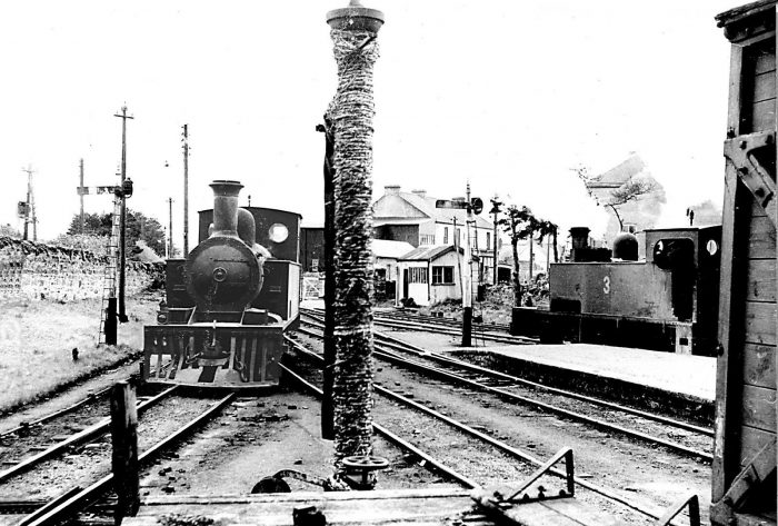 Arigna Station at the end of the tramway from Ballinamore. A short train is in the station under the control of 2-6-0T loco. No. 3T originally from the Tralee & Dingle Railway. The e/tension left the station behind the train beypmnd the station building. [14]