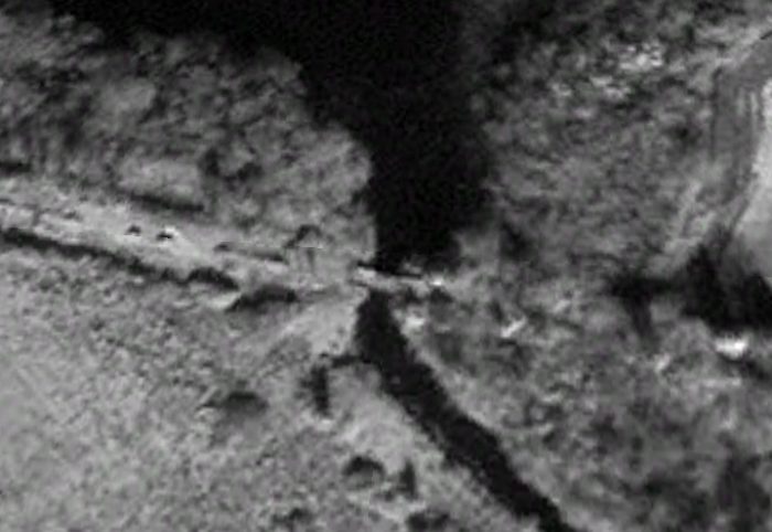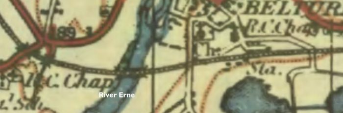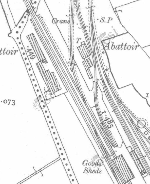 The approximate alignment of the railway shown by green line on the adjacent Bing satellite image does not define a point at which this occurred.