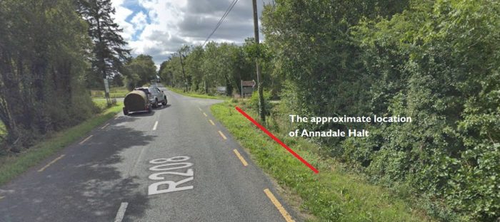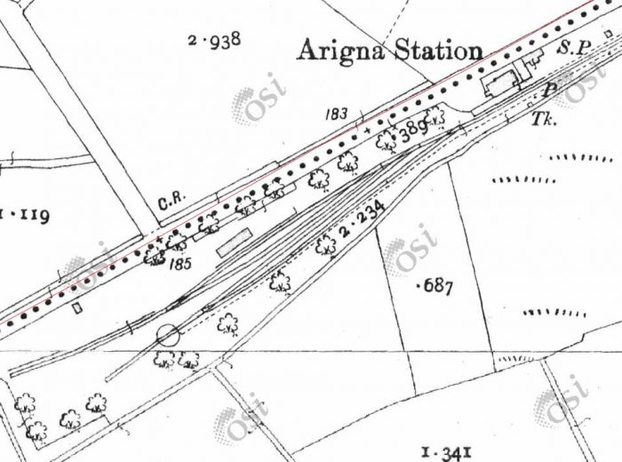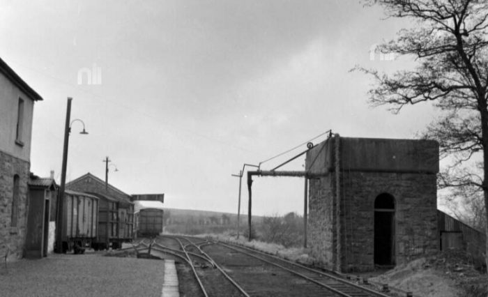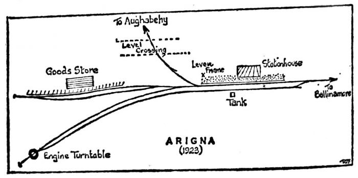 The intermediate point of Derreenavoggy was reached on the same grade but on a nine-chain left-hand curve. At 1 mile 34 chains there was an ungated level crossing with the Arigna village-Keadue road and the facing points for two sidings were situated about thirty yards farther on. [11]