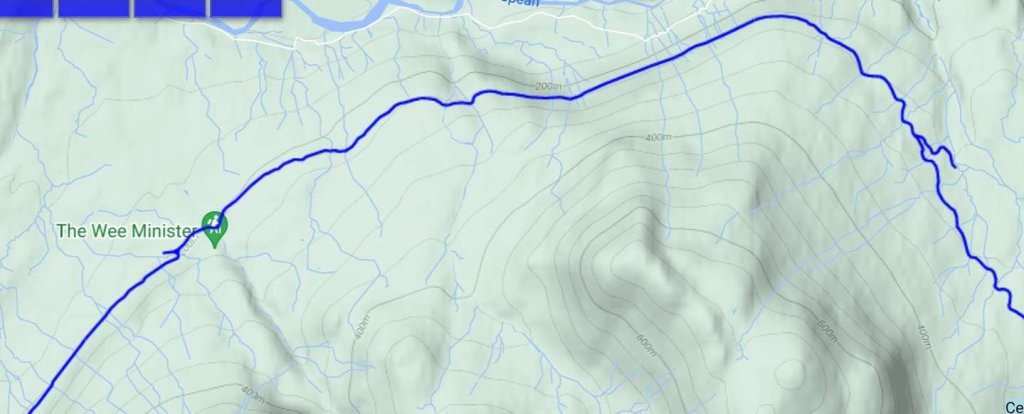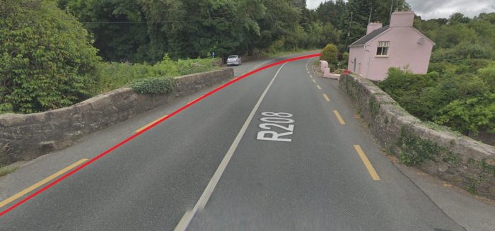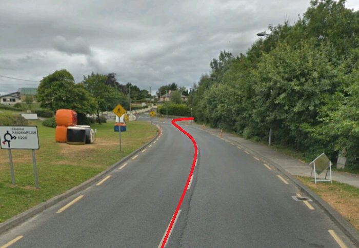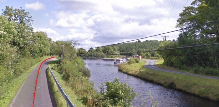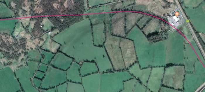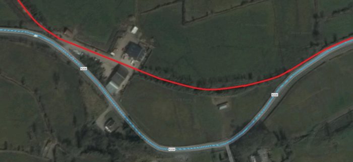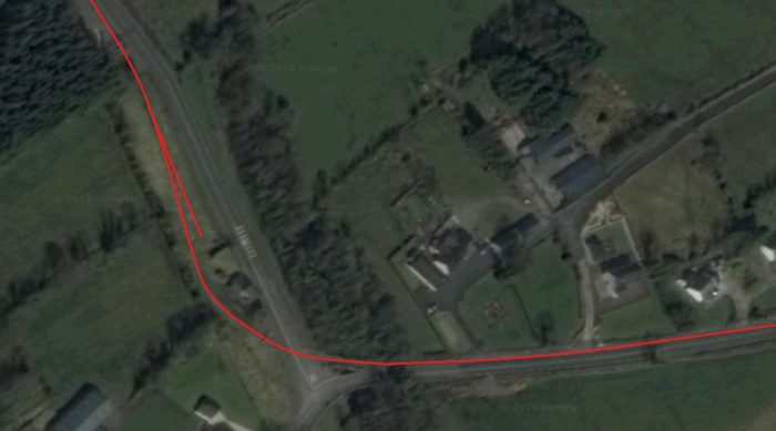 One location where this is true is on the long sweeping curve through which the line changes from a predominantly northerly trajectory to one which heads West. This is visible on the Google Streetview image be!ow the adjacent aerial view.