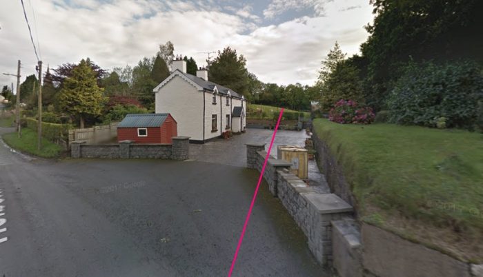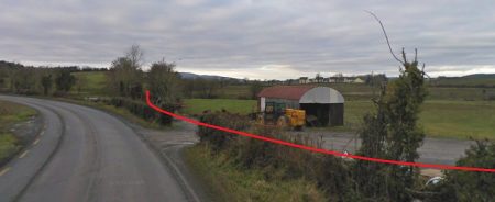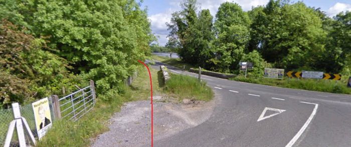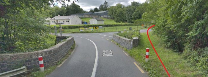 Although still parallel to the tortuous course of the river, the earlier abandoned extension line beyond Derreenavoggy was jigger up on the hillside and, after crossing the narrow roadway at 1.75 miles, remained on the right-hand side. Having turned northwards it can be picked out on the adjacent OS Map at around the 300ft contour. However, it is impossible to discern the point at which the line switched from the West side of the road to the East.