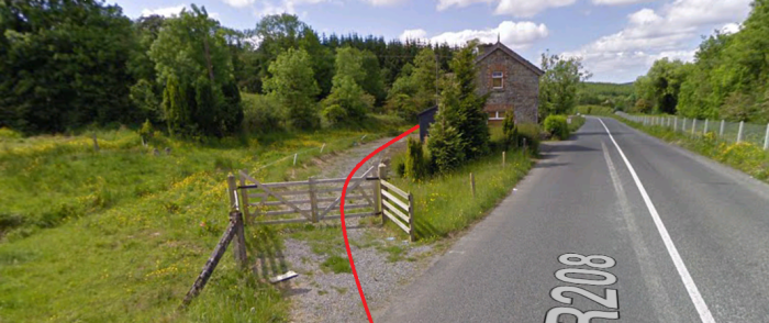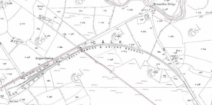 As can be seen above, the line then veered right on an eight-chain curve and crossed the road leading up to the mountain coal pits of Derreenavoggy and Rover. Again the crossing had no gates. The mines were located West of Derreenavoggy higher in the hills in the area now set aside as the Arigna Mining Experience.