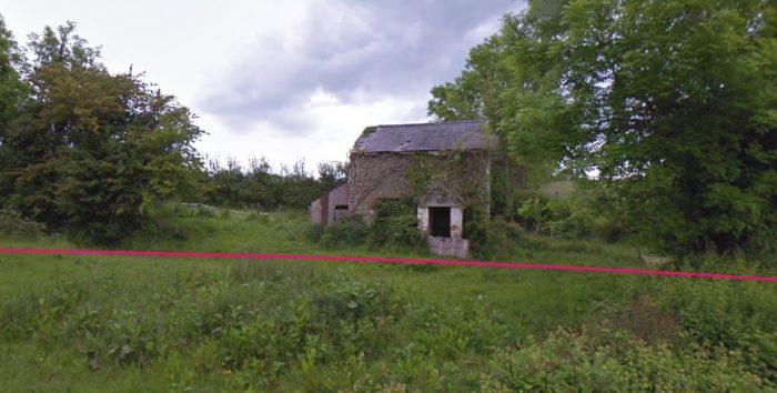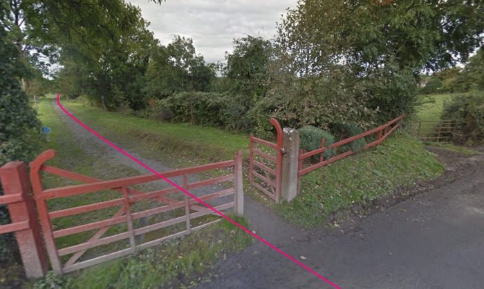 This picture is taken at the bend in the road at the top of the left-hand edge of the OS Map above. The railway ran through the location of the barn and behind the house in the picture.