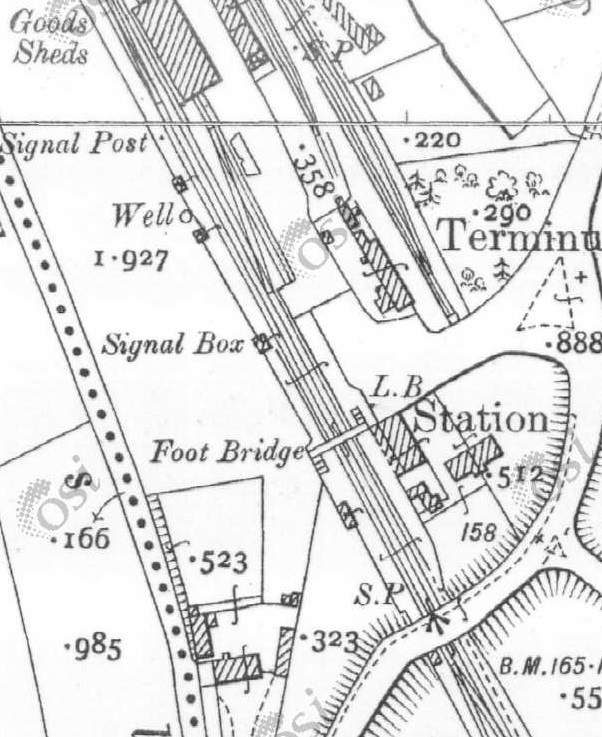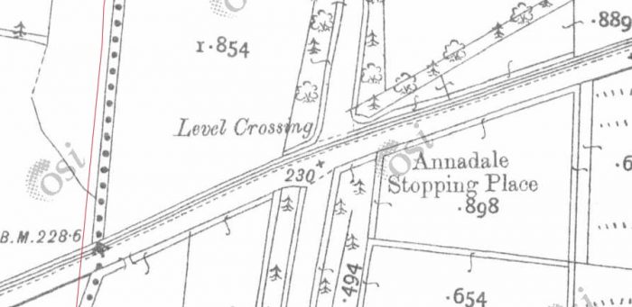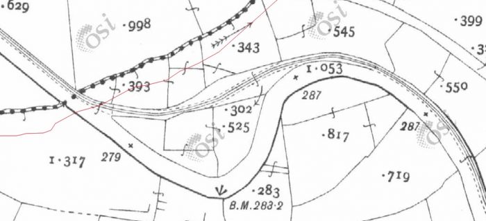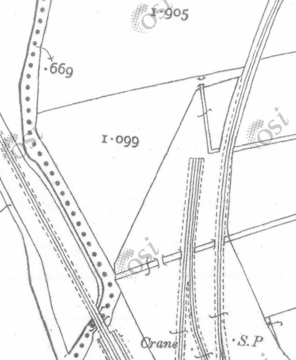 The 1940s OS Maps of ireland do a slightly better job of highlighting the route of the extension. This excerpt matches the satellite image above. The resolution is not the best. [16]