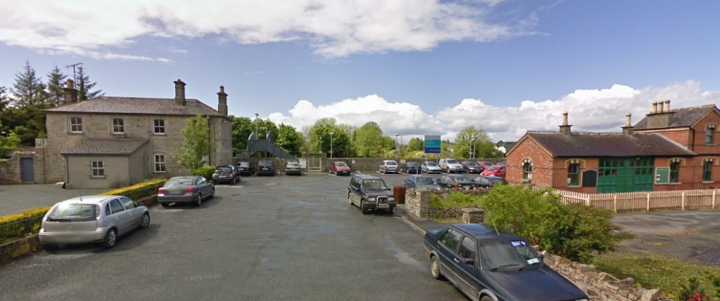 The green arrow shows the approximate line of the two roads through DerreenavoggyArigna which are shown in the monochrome images above. The photographer has turned through 180° before taking the picture below. The buildings in the monochrome images may well be thosetof the Arigna Fuel Company in the picture above or they have disappeared and their place has been taken by a tarmac car park.
