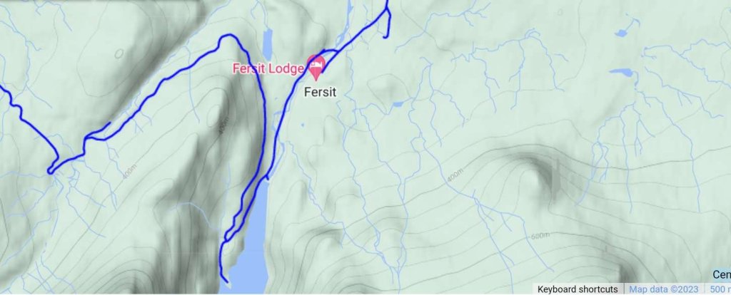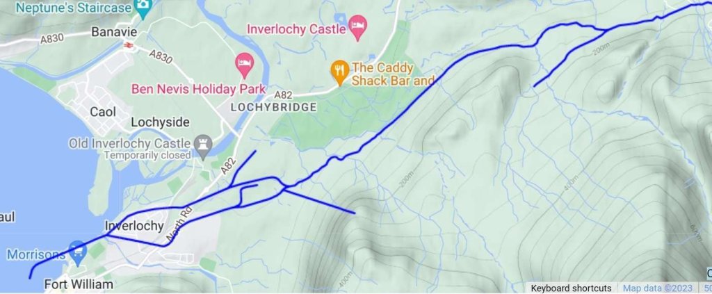 The line curved to the North following the Arigna River. My approximate line has drifted a little to the East of the actual route which can be picked out just to the left of the green line.