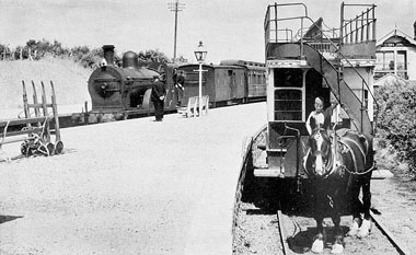 Opened from Portrush station to Bushmills in January, 1883, the line was extended to the ultimate terminus at Giant’s Causeway in 1887. The original current collection was from a side conductor rail 17in. above ground and 22in. from the inside running rail. This method was of course unsuited to a street tramway and the portion of the line which ran in the centre of the street through the town of Portrush was therefore worked by steam tram engines of the usual vertical boiler pattern. This method of operation of the first half-mile of the tramway persisted until 1899, when a change over to the overhead trolley system was made. From that date until 1915 the steam tram engines were retained for use during the peak traffic periods in the summer at which time the original power station proved inadequate for the needs of the system.” [1: p185]