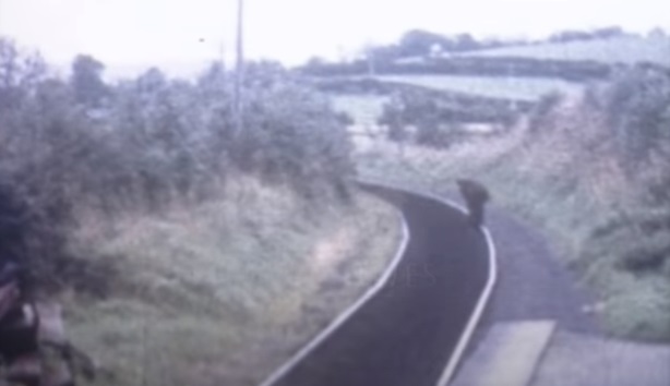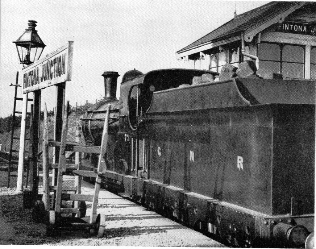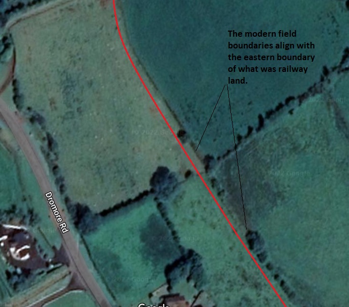 Beyond Dunluce, the line ran inland for a short distance below Gallows Hill, reaching the coast again at its most spectacular point. Here one could gaze down 140ft. to the foam-covered rocks below. From this point the line again ran inland and after three more passing loops reached Bushmills, a village known for its whisky. Bushmills had a light railway station provided with waiting room, luggage office and lavatories.” [1: p,186-187]