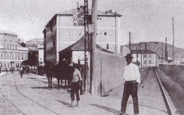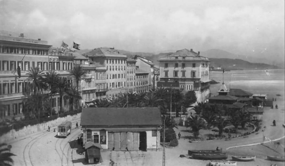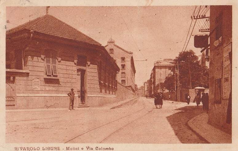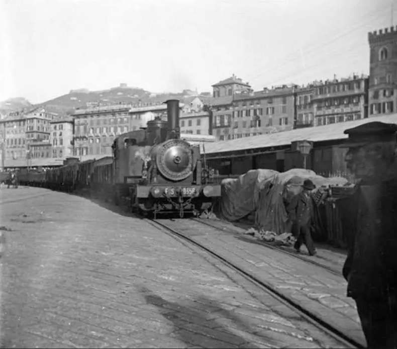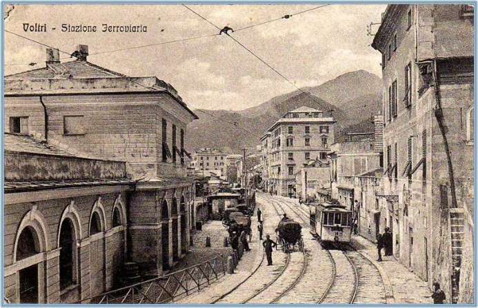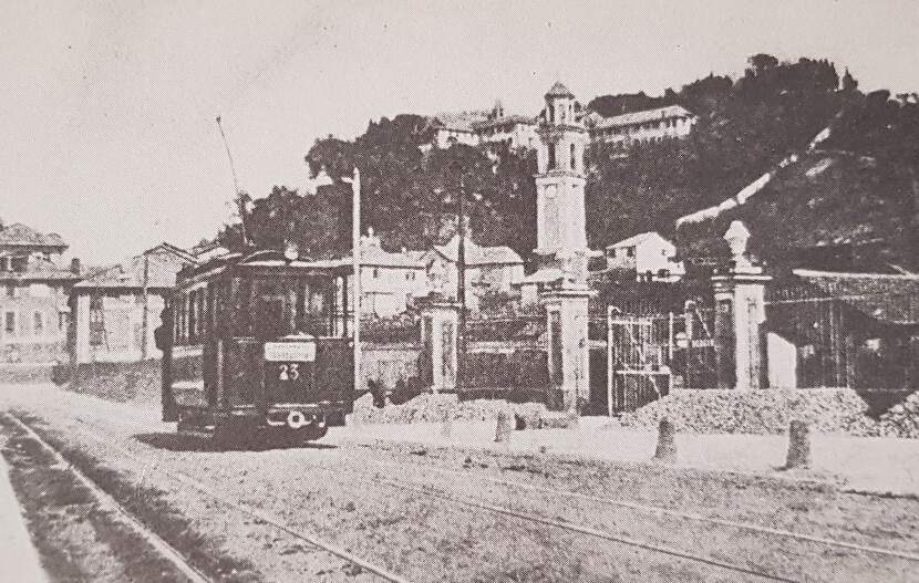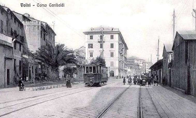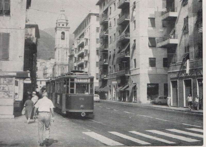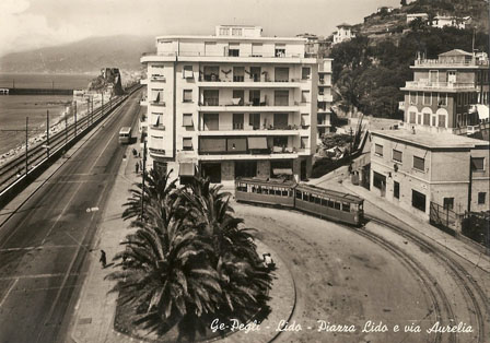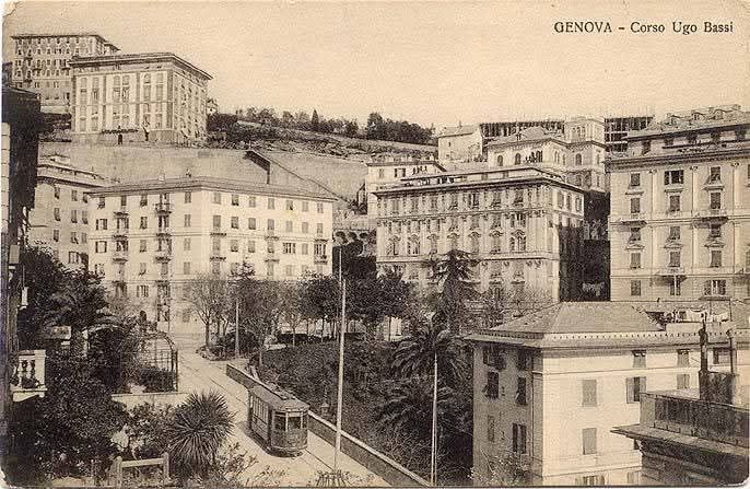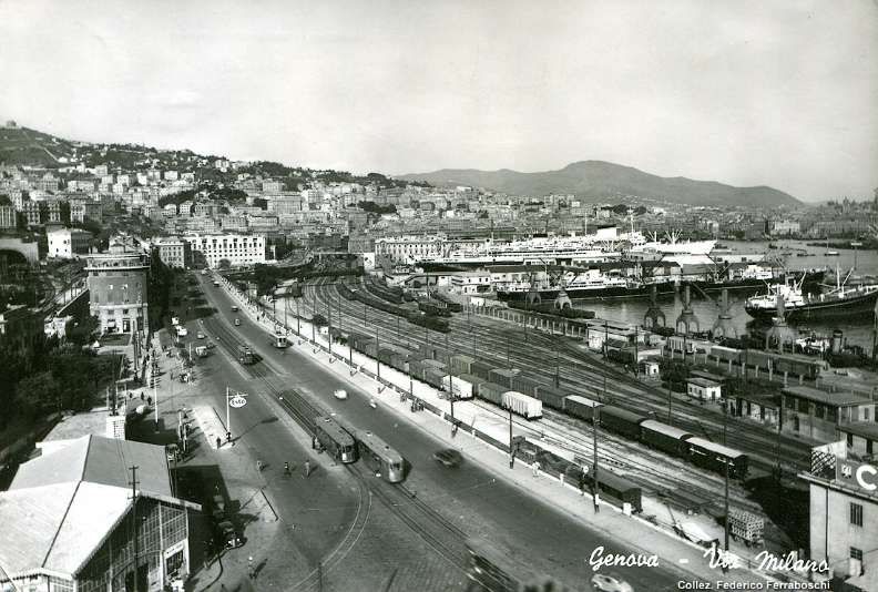 A second tramway was built which ran alongside the railway sidings on what is now the SS1, it was then Via Milano, towards Sampierdarena. The route is illustrated by the mid-20th century view below.