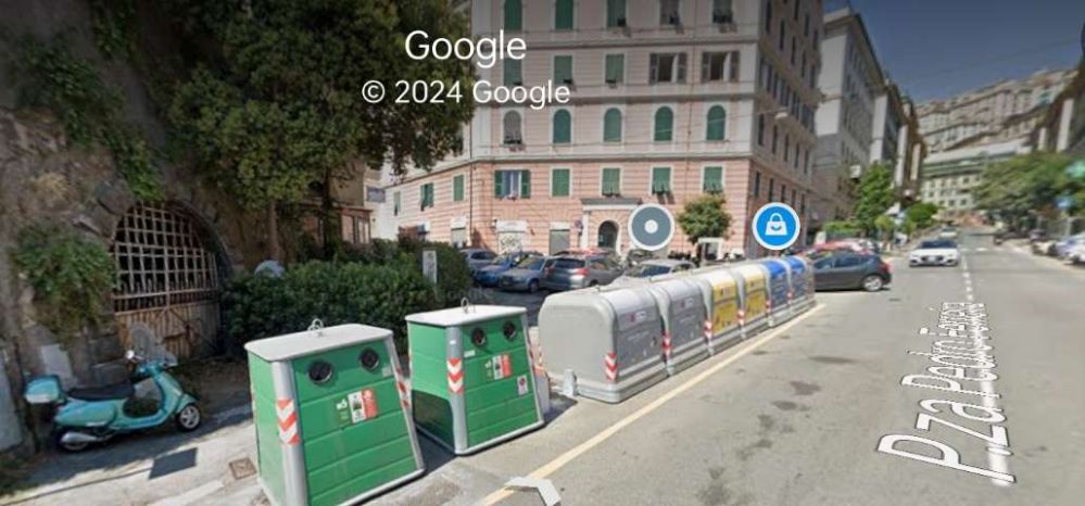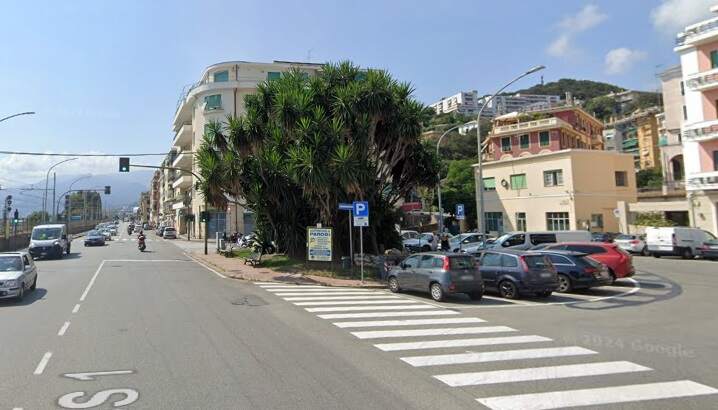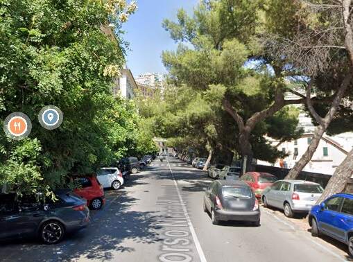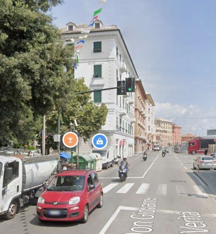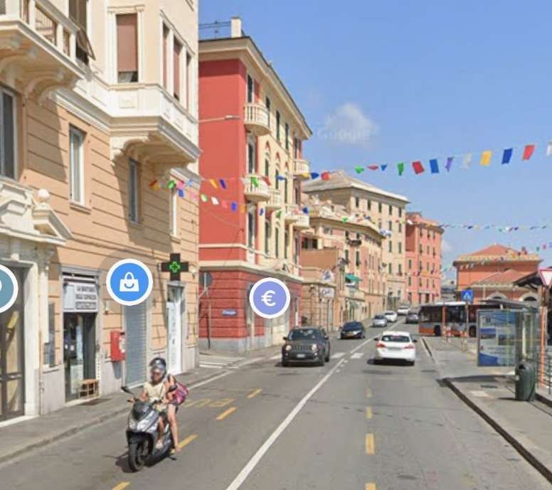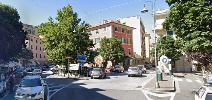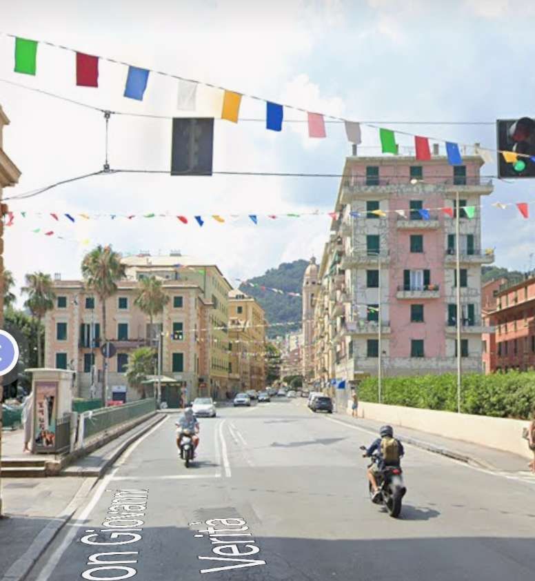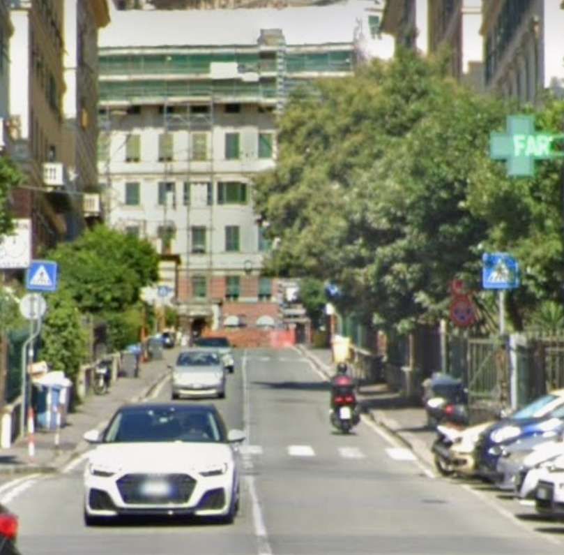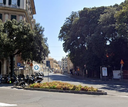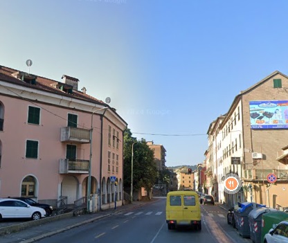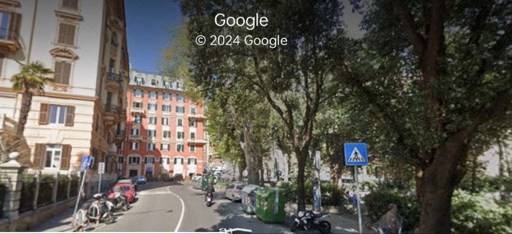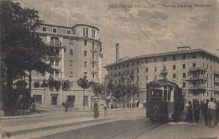 A relatively low quality image of Piazza San Marino and Via Umberto 1. The piazza later became Piazza Ricardo Masnata. This view looks North with a tram visible on the left, (c) Public Domain. [64]Piazza Ricardo Masnata, looking North. There is little to link this image from 2024 with the monochrome image above, other than the alignment of the roads and the shape of the piazza. However, at the centre of this image is a lower building which also appears in the monochrome image. [Google Streetview, August 2024]Via Umberto 1 looking North from what became Piazza Ricardo Masnata, (c) Public Domain. [67]The same location in the 21st century. [GVia Umberto 1, now Via Walter Fillak with a tram heading towards Genoa. [69]The same location on Via Walter Fillak in the 21st century. [Google Streetview, August 2024]