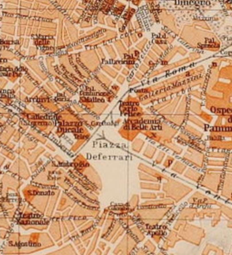 Lines 1 to 11 constituted the Western Network. All of these lines had their city centre terminus at Piazza Caricamento. The Piazza is shown on the adjacent 1916 map.