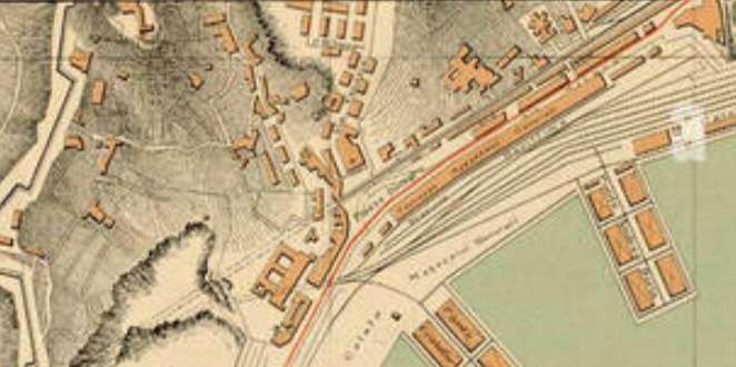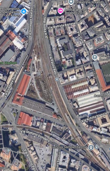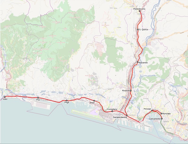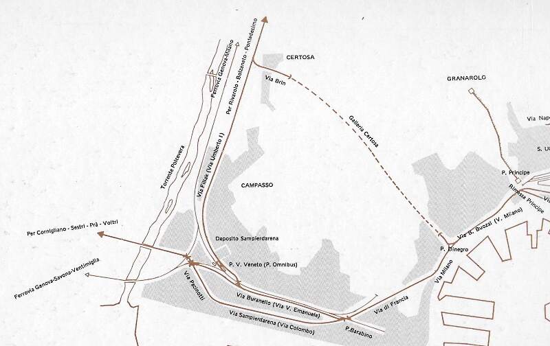 At Sampierdarena the original lines of the Western network separated. Some lines continuing along the coast and others turning inland. The lines diverged at the West end of Piazza Vittorio Veneto. The coastal line ran along what is today Via Frederico Avio, then turned onto what is now Via Antonio Pacinotti, before turning West on what is now Via Raffaele Pieragostini, crossing the River Polcevera at Ponte di Cornigliano, running along Via Giovanni Ansaldo before joining Via Cornigliano at Piazza Andrea Massena.