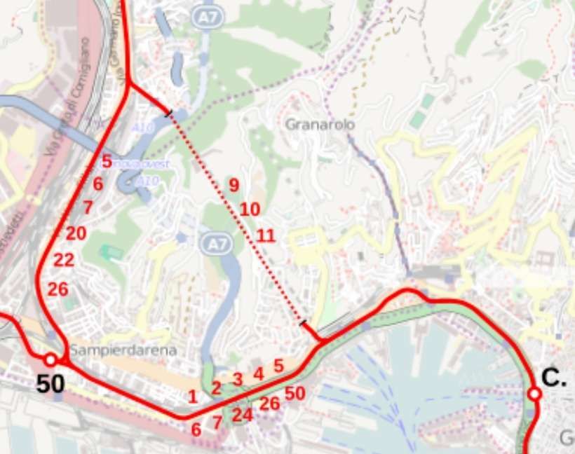 21 De Ferrari – Manin – Staglieno 22 De Ferrari – Manin 23 De Ferrari – Manin – Castelletto 24 De Ferrari – Manin – Castelletto – San Nicholo 25 Circuit in the hilly suburbs 26 Piazza Principe – Corso Ugo Bassi 27 De Ferrari – Zecca – Principe 28 Caricamento – De Ferrari – Galliera ‘Ospital 29 De Ferrari – Carignano 30 Circular Raibetta – Brignole – Corvetto – Raibetta 31 De Ferrari – Staglieno – Molassana – Prato 32 De Ferrari – Staglieno – Molassana 33 De Ferrari – Pila – Staglieno 34 Staglieno – Iassa 35 Pila – Staglieno 36 Pila – Staglieno – Molassana 37 De Ferrari – San Fruttuoso 38 De Ferrari – Foce 39 De Ferrari – San Francesco – Sturla – Priaruggia – Quinto – Nervi 40 De Ferrari – San Francesco – Sturla – Priaruggia – Quinto 41 De Ferrari – San Francesco – Sturla – Priaruggia 42 De Ferrari – San Francesco – Sturla 43 De Ferrari – Villa Raggio – Lido 44 De Ferrari – Tommaseo – San Martino – Borgoratti 45 De Ferrari – Tommaseo – San Martino – Sturla 46 De Ferrari – Tommaseo – San Martino 47 De Ferrari – Tommaseo 48 Raibetta – Pila