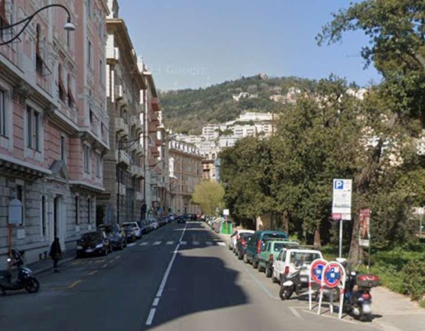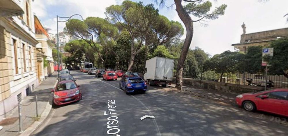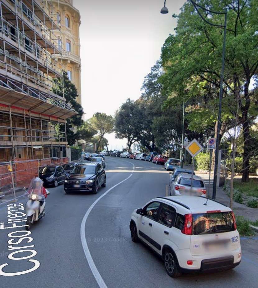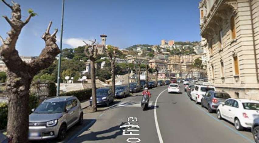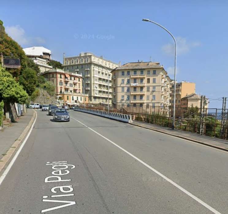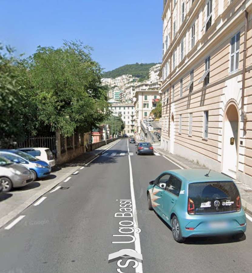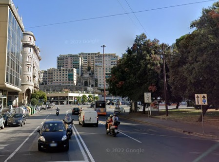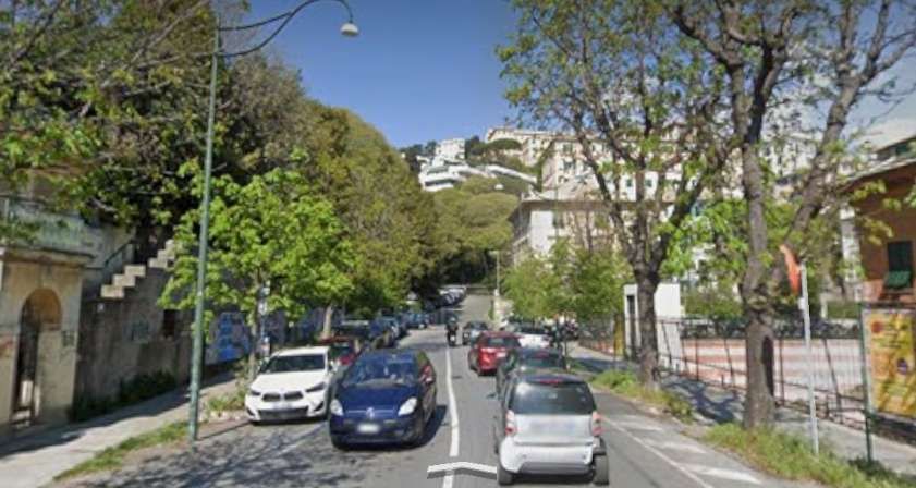 Tram No 79 leads a trailer car South on Via San Quirico in the first decades of the 20th century. It seems as though Ponte Tullio Barbieri can be seen behind the tram. This image was shared by Sergio De Nicolai on the C’era una volta Genova Facebook Group on 21st October 2018. [88]A similar location on Via San Quirico in the 21st century. [Google Streetview, July 2022]