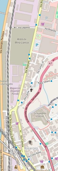 The tramway followed Via Celesia through Rivarolo (Superior). Rivarolo and Via Celesia can be seen at the bottom of this extract from openstreetmap.org. [79]