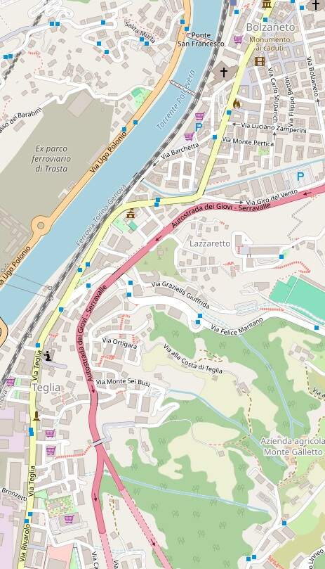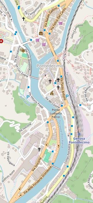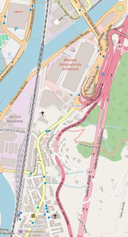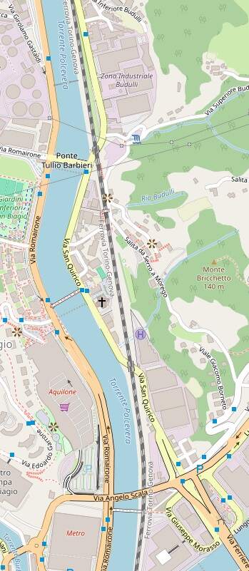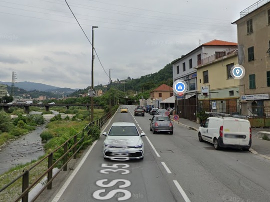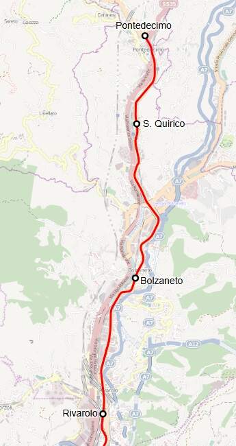 North of Bratte, Trams crossed the River Secca, a tributary of the Polcevera, following Via Ferriere Bruzzo and then continued North alongside the River Polcevera on Via San Quirico.