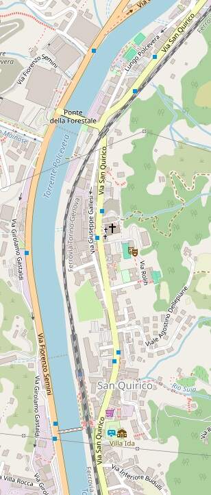 Trams passed under the FS Standard-gauge lines close to Ponte Tullio Barbieri. [Google Streetview, June 2022]Trams ran on through the centre on San Quirico on Via San Quirico.Before returning to the side of the river, passing under the railway again. [Google Streetview, July 2022]