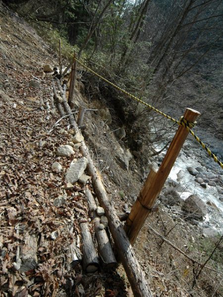 This picture was taken just a little further along the line for the colour photograph above. It probably shows the earliest incarnation of the Atera Railway. [30]The line crossed a minor road and continued to climb. [30]Within a few hundred metres the tarmac comes to an end and the old line’s route becomes a footpath. [30]The old track-bed continues as a footpath. It follows the West bank of the river. [30]The quality of the formation gradually degrades and in certain places has collapsed into the river. [30]The Asi Yamazawa bridge (アシ山沢橋梁). [30]