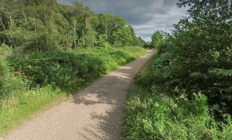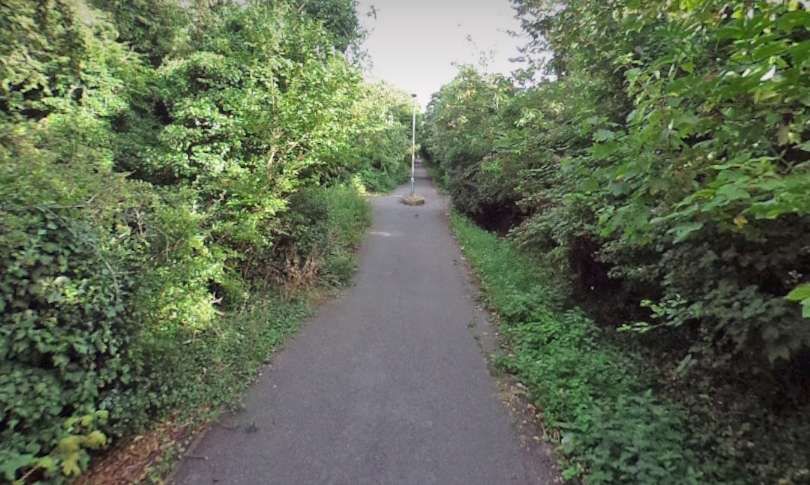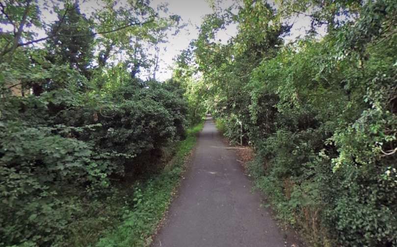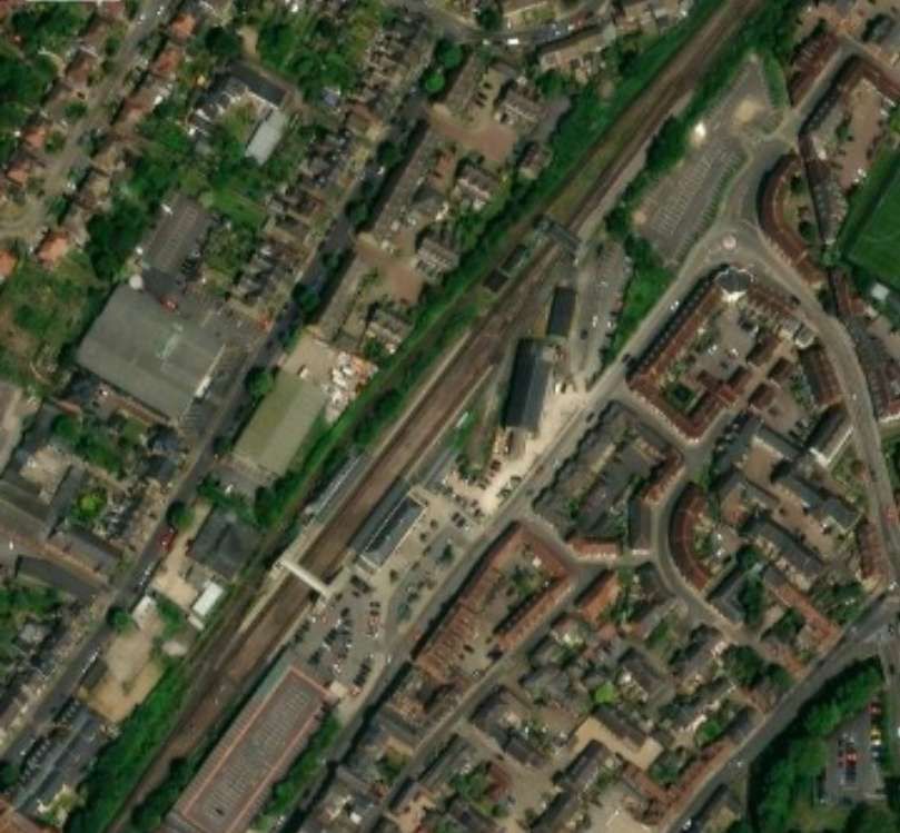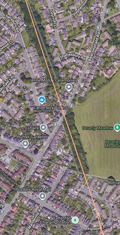 North of the railway corridor the route of the old railway, shown in pale orange, runs North-northwest. It crosses Hanover Place twice and runs ups the West side of Beverly Meadow. The route is tree-lined as far as Beaconsfield Road. A footpath runs immediately alongside to the route. That footpath appears as a grey line on the satellite imagery adjacent to this text.