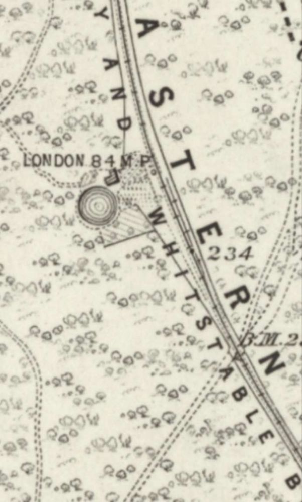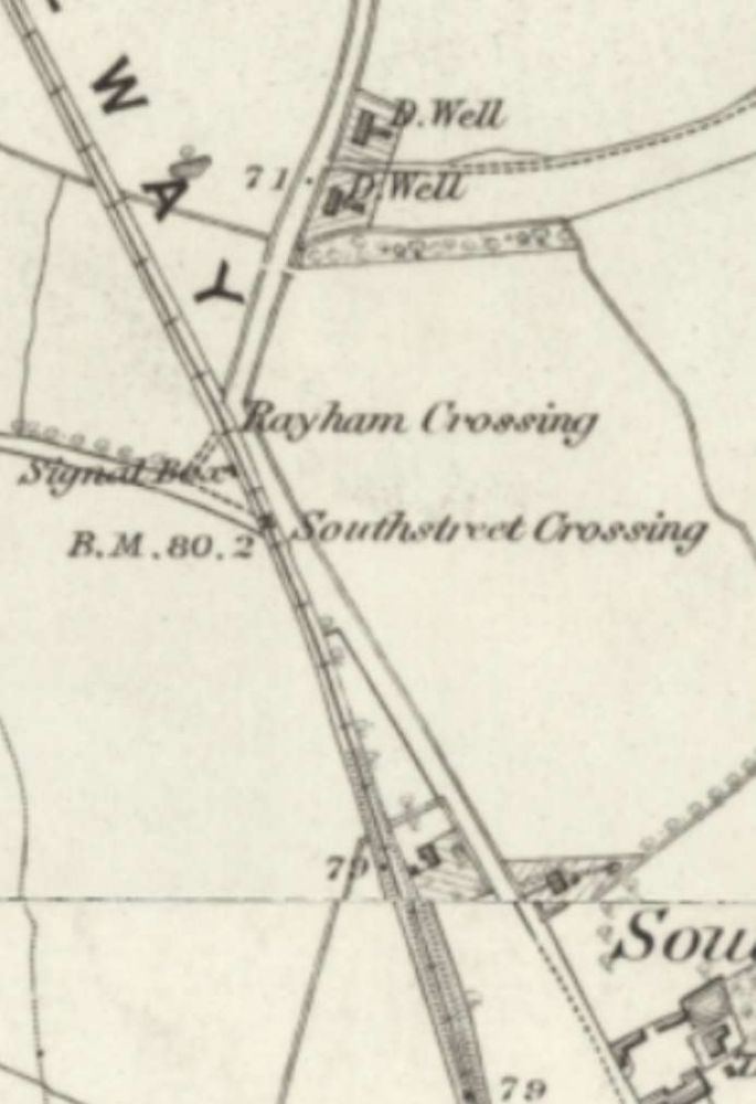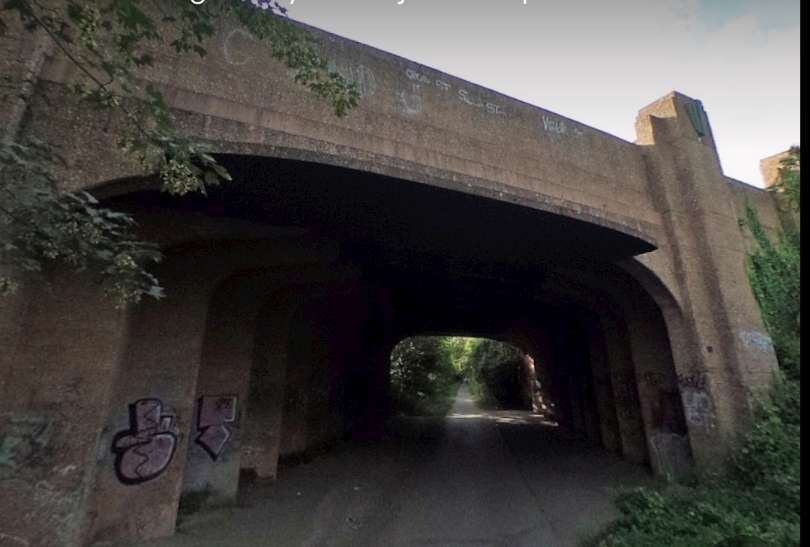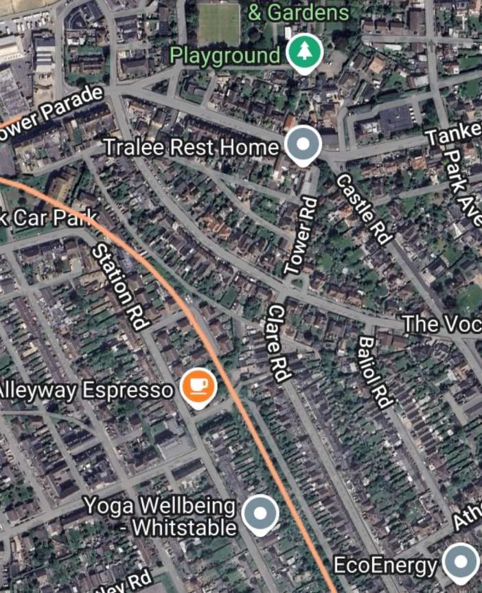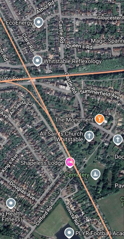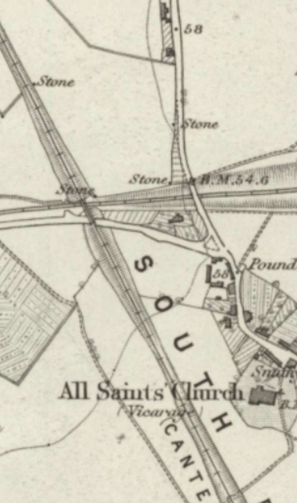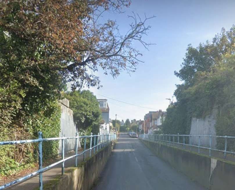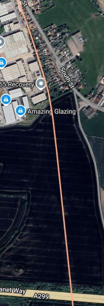 Looking South from the A299 along the route of the old railway, nothing remains to show that this was once the location of the old railway. [Google Streetview, August 2024]Looking North from the A299 along the line of the old railway – there is nothing to see. [Google Streetview, August 2024]At the bottom of the incline the old railway curved a little to the Northwest and met South Street tangentially. A level-crossing took the line across what is now Millstrood Road. [11]The length of the line shown on the OS Map extract above is the bottom half of the old line as it appears on this modern satellite image from railmaponline.com. [15]