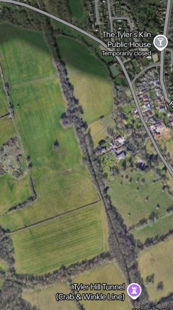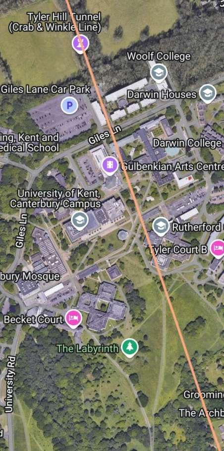 Tyler Hill Tunnel runs underneath the Canterbury Campus of the University of Kent. Its South Portal was adjacent to the Archbishop of Canterbury’s School at the bottom-right of the adjacent satellite image. [15]