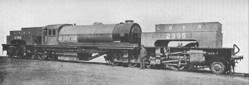 The wide range of modern freight vehicles was well shown by the 18 wagons, etc, of different types exhibited by the LNER, varying from a four-wheeled horse-box to a set of three 60-ton flat wagons tight coupled for conveying 160-ton guns. The GWR showed a 20-ton mineral wagon, a 35-ton well trolley, a 30-ton articulated gun wagon, and a 70-ft. rail or timber truck. There were a few items of old goods rolling-stock, including a ‘Chaldron’ coal wagon built in 1826.