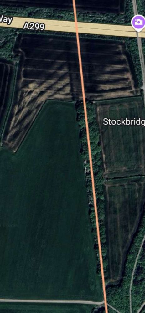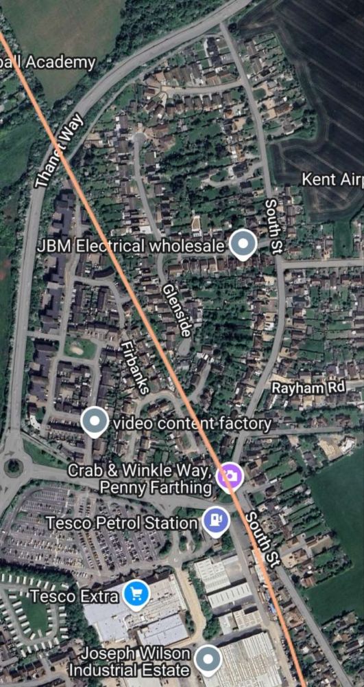 The two extracts from railmaponline.com’s satellite imagery above show the route of the old line as it runs down across the line of the modern A299 (at the top of the first image and at the bottom of the second image). In each case, if you cannot see the full image, double-click on it to enlarge it. For the majority of this length the old railway line followed a straight course. [15]