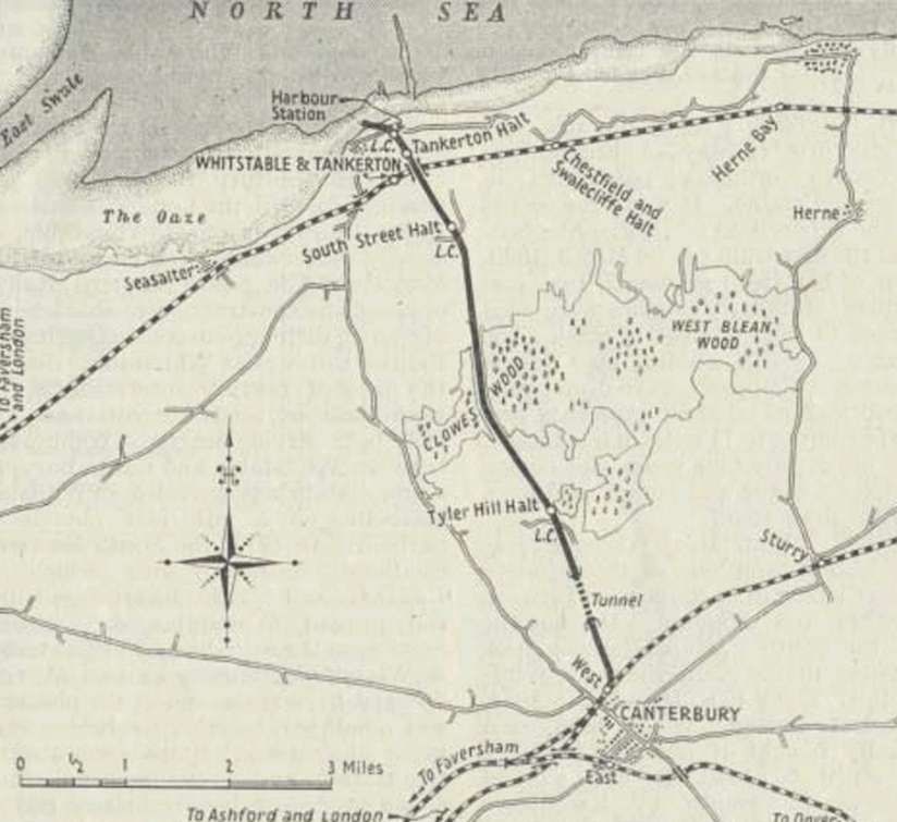 “The financial receipts improved steadily and throughout the remainder of the nineteenth century the line was prosperous. In 1860, the London, Chatham & Dover Railway reached Whitstable, and shortly afterwards was extended to Margate. The South Eastern Railway opposed the construction of this line and, of course, there was no connection between the two railways at Whitstable. Early in the [20th] century intermediate halts were built at South Street, and Tyler Hill, both serving scattered communities between Whitstable and Canterbury, and a new station was provided at Whitstable Harbour, on a site just outside the harbour. In 1913, the South Eastern & Chatham Railway, into which the L.C.D.R. and S.E.R. had merged, built the present Whitstable & Tankerton Station on the main line. The Canterbury & Whitstable Railway crossed over this line just beyond the end of the platforms, and a halt was built on the bridge at the point of crossing. Steps connected the two stations and special facilities, such as cheap day tickets between Herne Bay and Canterbury via Whitstable, were commenced. After the first world war, local bus competition became intensive and the inevitable decline followed. In 1930, it was decided to close the line to passengers and the last passenger train ran on 31st December of that year. This decision must have brought the Southern Railway more relief than regret, for, in consequence of the one tunnel (Tyler Hill) on the route, clearances are very limited, and only selected engines and special coaching stock can work over it. From 1931 onwards the line has been used regularly for goods traffic, and today [in 1950], with total closure a possibility in the near future, it provides a wealth of interest.” [19: p125-126]