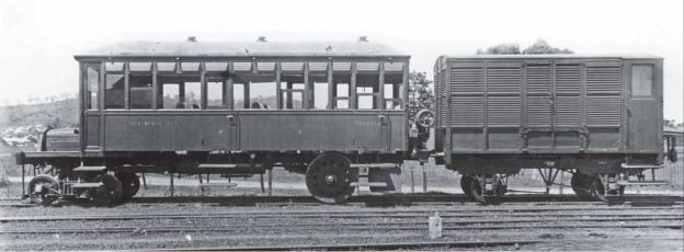 “The wooden body … was finished in narrow tongue and groove boards. It was divided into three separate sections, accommodating 33 passengers and 2 crew. The first section was the cab, which accommodated the train crew (the driver and the guard). The second section (the forward compartment) accommodated 23 passengers and the third section (the rear compartment) was a smoking area and accommodated 10 passengers. The two passenger compartments were fitted with transverse seats and drop type windows, and each compartment had two doors, which opened outwards. There was no interconnection between the three compartments. Steps were fitted under each of the doors to allow passengers to alight from the vehicle to ground level.” [3]