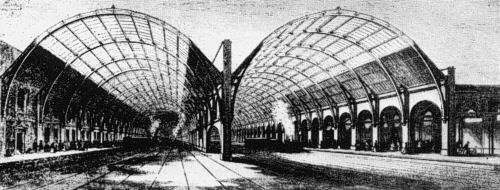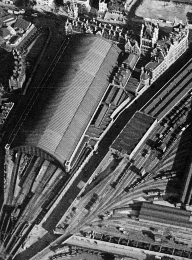 “Opened on 8th August 1910 by the London and North Western Railway, Manchester Mayfield was built alongside Manchester London Road station (later Piccadilly) to handle the increased number of trains and passengers following the opening of the Styal Line in 1909. [4][5: p7] The LNWR had considered constructing a new platform at London Road between the [Manchester, South Junction and Altrincham Railway’s] MSJAR’s platforms 1 and 2, which were renumbered 1 and 3 in anticipation, but this was abandoned in favour of the construction of Mayfield; the platforms nevertheless remained renumbered. [6: p167] Four platforms were provided and passengers could reach London Road via a high-level footbridge. [6: p167][7: p43] Mayfield suffered the effects of bombing during World War II, when it was hit by a parachute mine on 22nd December 1940.” [8: illustration 40] [2]