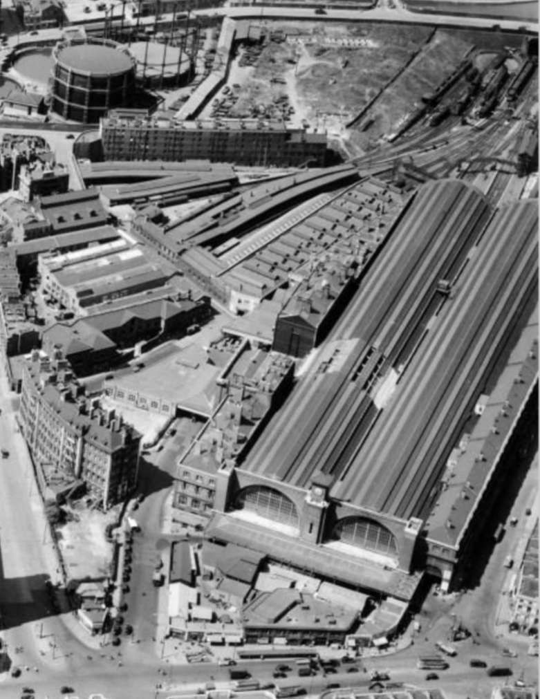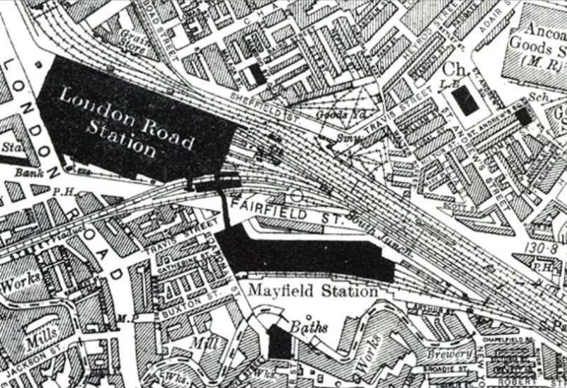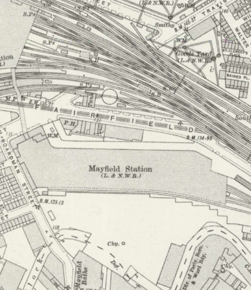 Manchester Mayfield Station was, “on the south side of Fairfield Street next to Manchester Piccadilly station, [Manchester London Road station, as it was in 1958]. Opened in 1910, Mayfield was constructed as a four-platform relief station adjacent to Piccadilly to alleviate overcrowding. In 1960, the station was closed to passengers and, in 1986, it was permanently closed to all services having seen further use as a parcels depot.” [2]