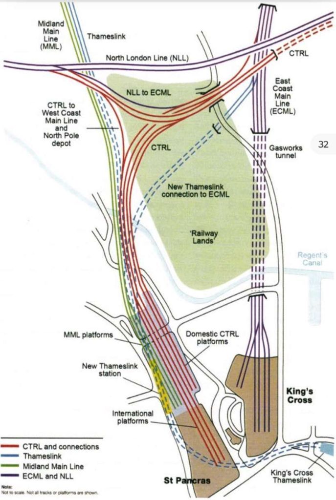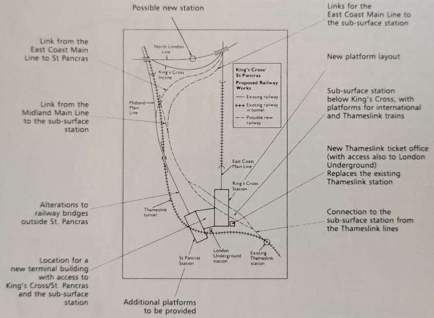 “A study was carried out by Mott MacDonald in 2000, which looked at possibilities of increasing capacity at the Piccadilly station. One solution put forward would see the track quadrupled between Slade Lane Junction and Piccadilly, with a pair of through platforms in the Mayfield goods yard to the south of Piccadilly’s platforms 13 and 14 linked to additional running lines to Ashburys station. This proposal was supported by the Greater Manchester Passenger Transport Executive as it would increase usable train paths through Piccadilly by between 33% and 50%; the extra track would, however, require an expensive extension to the Piccadilly – Deansgate viaduct carrying the track from Slade Lane. The location of the proposed platforms was also criticised, as it would entail ‘a long walk for passengers wishing to interchange with other terminating rail services at Manchester Piccadilly or access the city centre’.” [2]