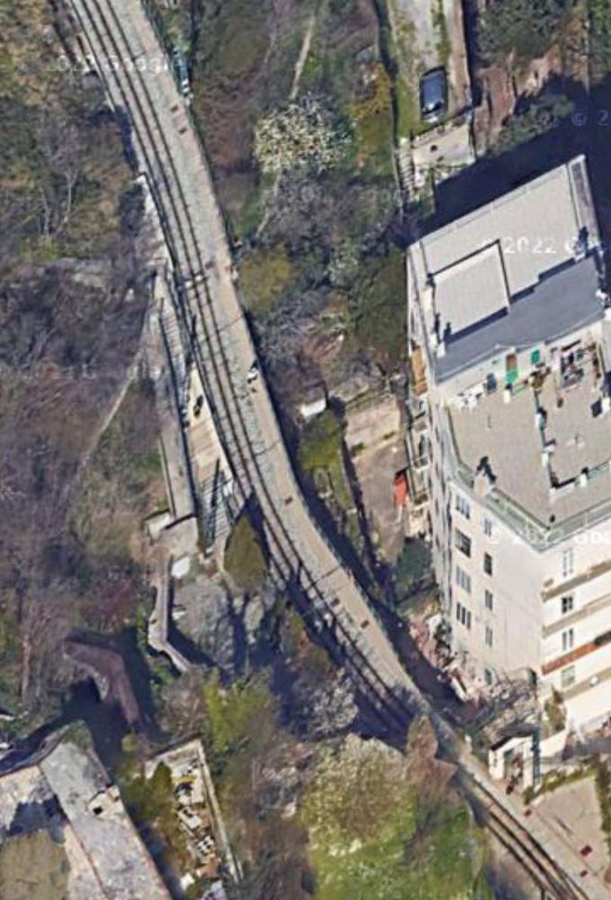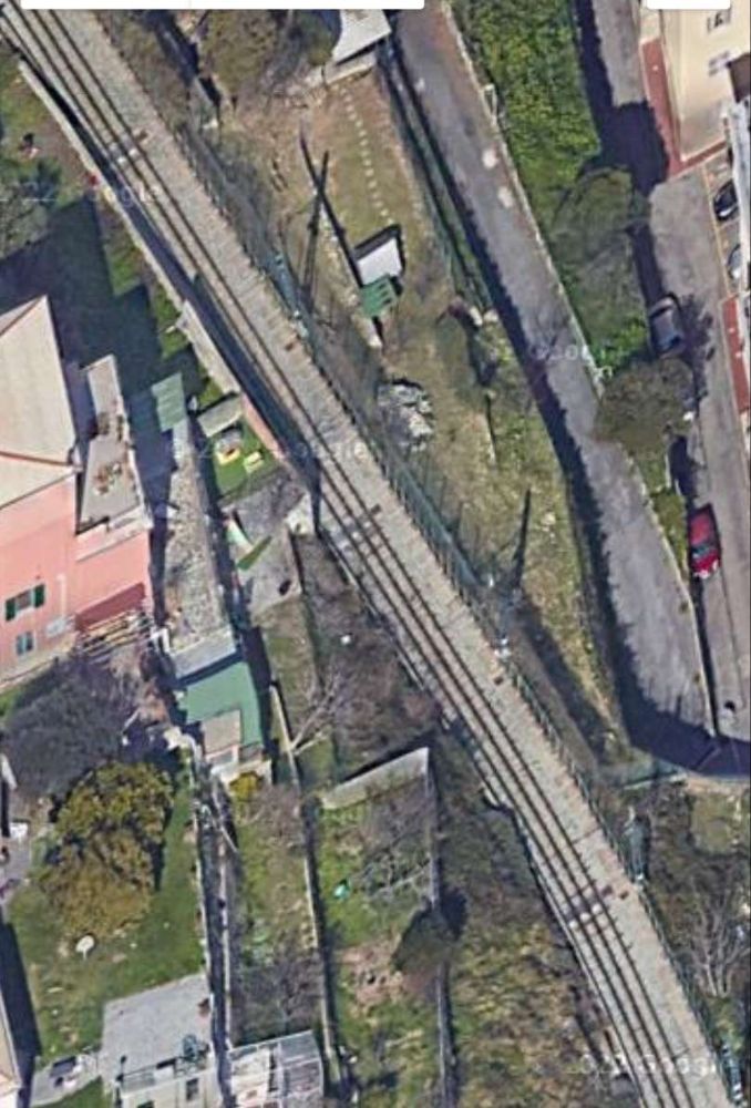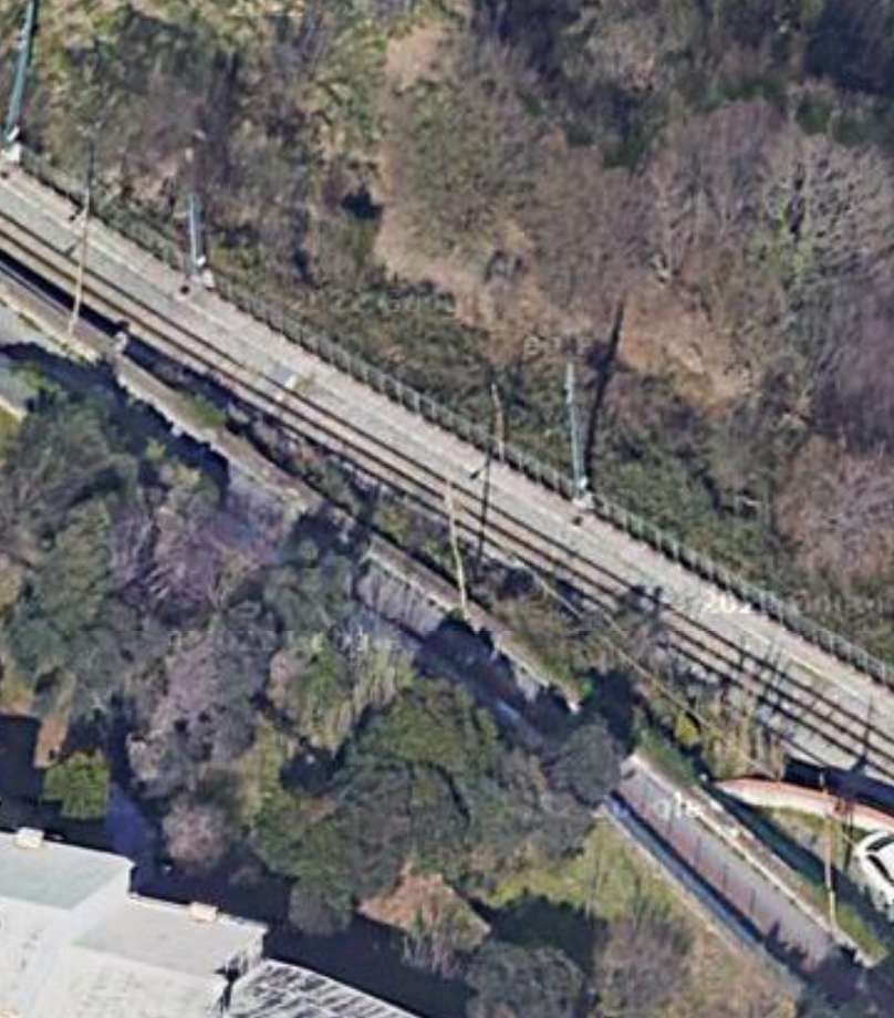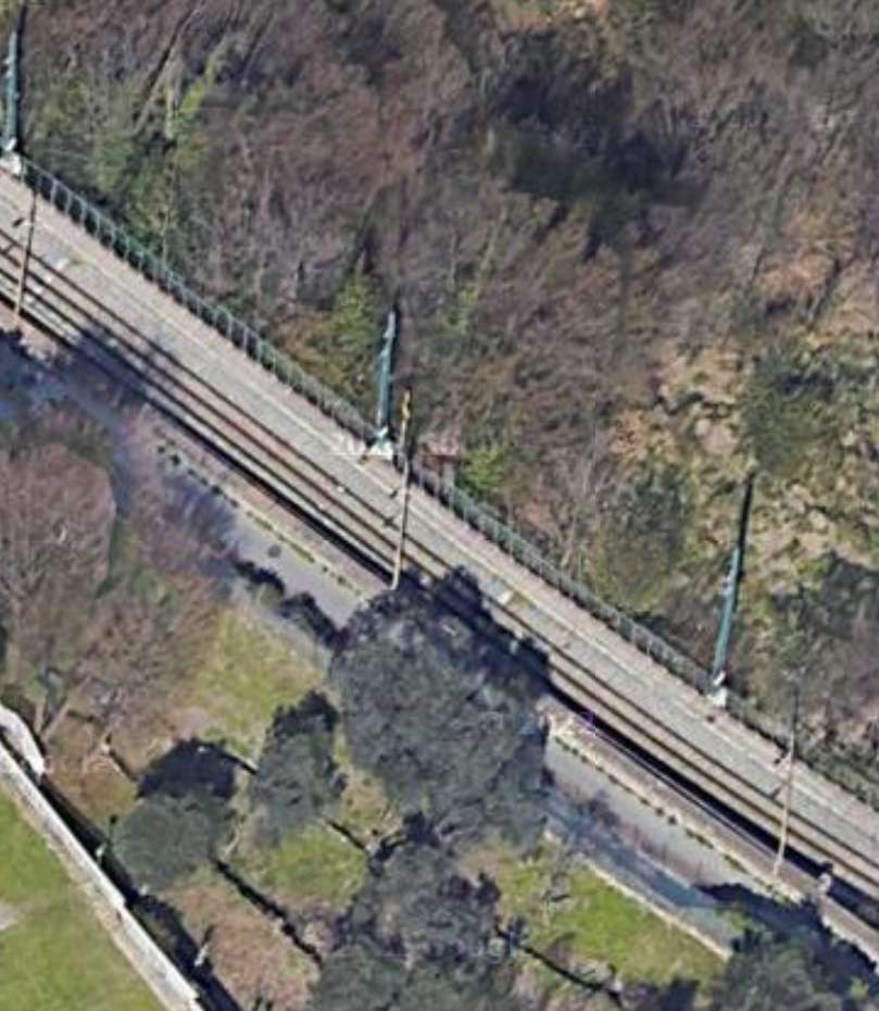 The line South of the crossing at Via Bartolomeo Bianco. Although downloaded from Google Earth in November 2824, the satellite image must be from before October when trams were running on the northern half of the railway.  [Google Earth, November 2024]