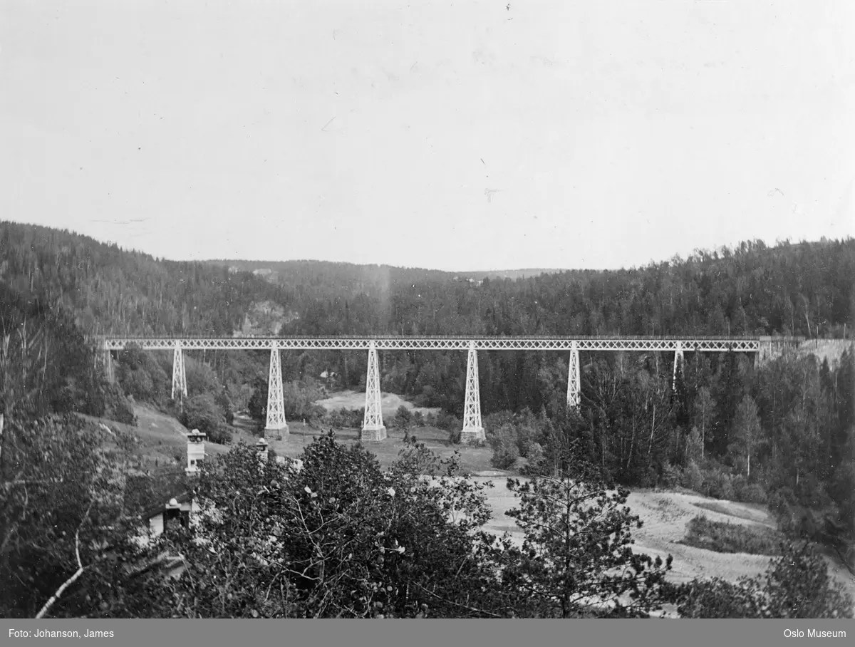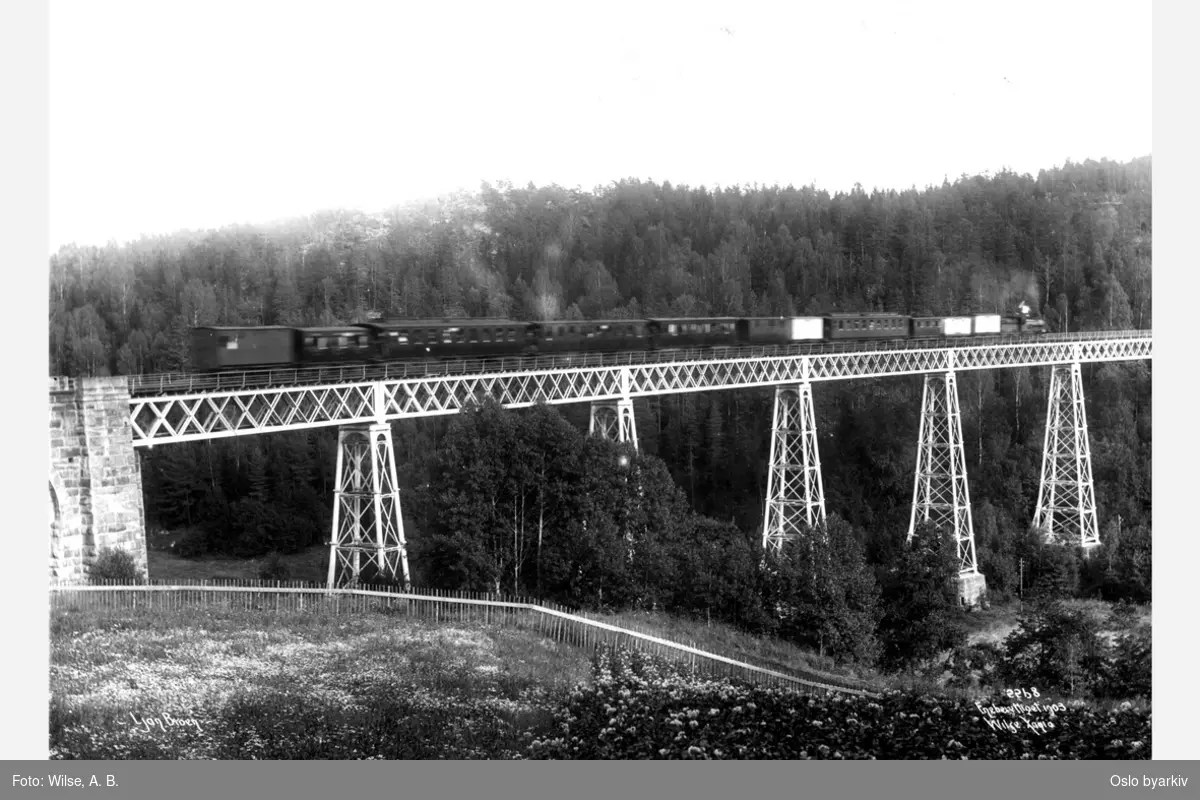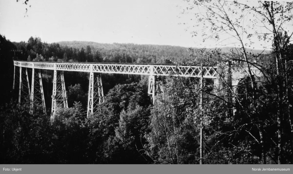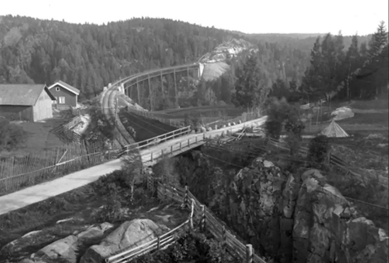 Ljans Viaduct near Christiania (Oslo). Sadly, the picture included in the Railway Magazine is too grainy, [1: p448] This image was found on an internet form and appears to be the same image that was used in The Railway Magazine, © Olaf Peder Martin. It is held in the collection of the Norsk Jernbarnemuseum. The Ljans viaduct was completed in 1878. The bridge was sold to Christiania Spigerverk after the line got re-aligned towards Hauketo in 1925. It was blown up to provide materials for nails in 1929. [9]