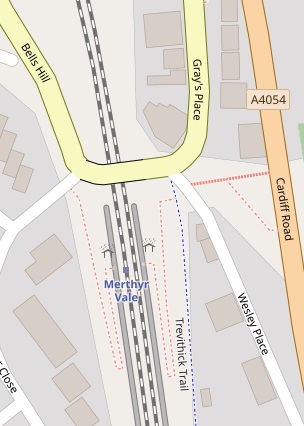 Merthyr Tramroad, or the Penydarren Tramroad, ran from quarries near Morlais Castle via a junction on the Dowlais to Jackson’s Wharf tramroad at SO 0512 0669 (at the present junction of Tramroadside North and Penydarren Road and now marked by the Trevithick Memorial (NPRN No. 91516)) in Merthyr Tydfil, to the Glamorganshire Canal basin at Abercynon (ST 0846 9493) where a commemorative plaque has been erected (NPRN No. 400379).