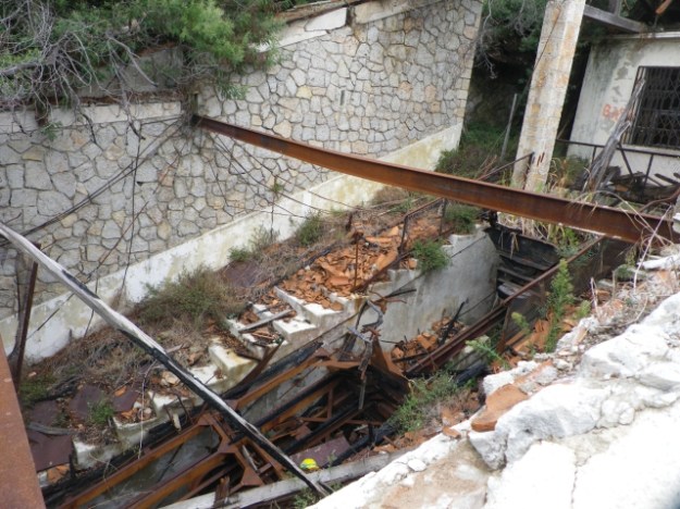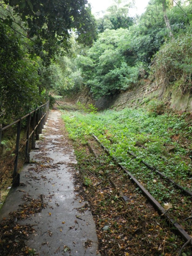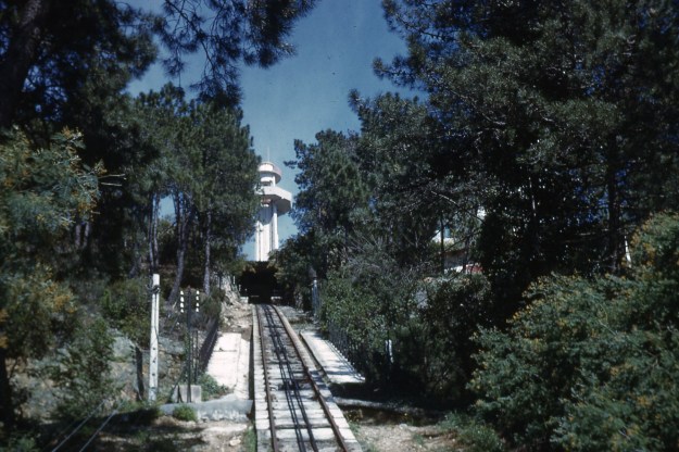 The funicular was on a steep grade, in a length of just 850m the funicular climbed to an altitude of 233m. There was one passing point at midpoint on the climb. The top station is shown below along with the wooden observatory refered to below.