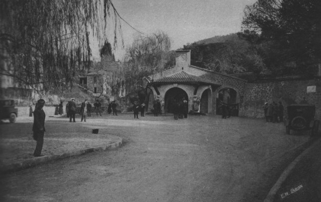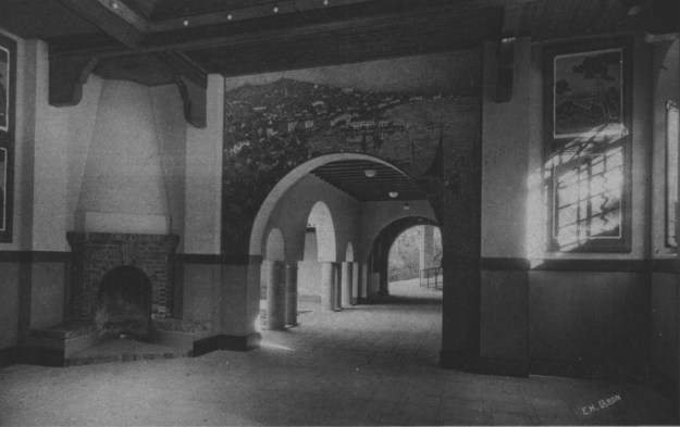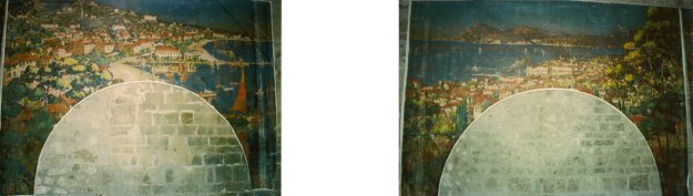 The lower station was designed to look like a chapel and was in the Neo-Provencal style. Wikipedia explains that this was, and remains, ‘a contemporary architectural and decorative style originating in Provence which extends along the French Mediterranean Coast and onto Corsica. … It replaces the traditional stone houses of the villages of the South of the country’.[2] It was decorated with a series of paintings by Louis Pastor.[3] A few images of the station and the paintings follow. Included among these pictures is a very early image of the funicular: